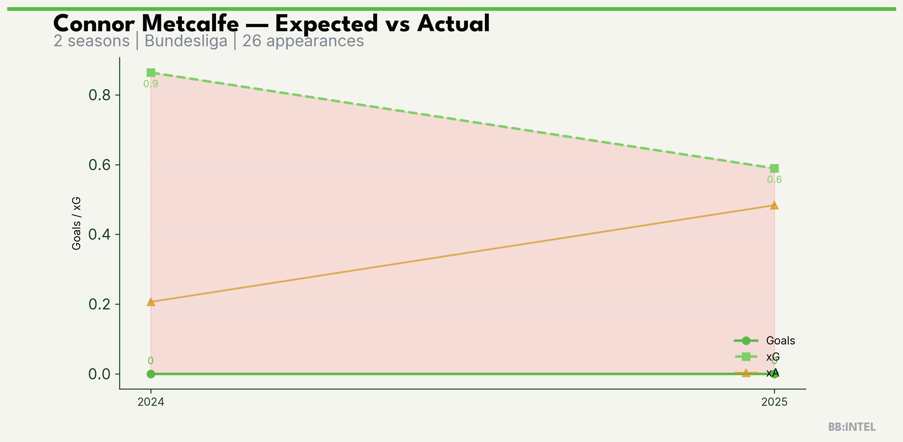 | 2025/2026 | Bundesliga | 16 | 0 | 0.6 | 0.5 | 11 | -0.6 |
