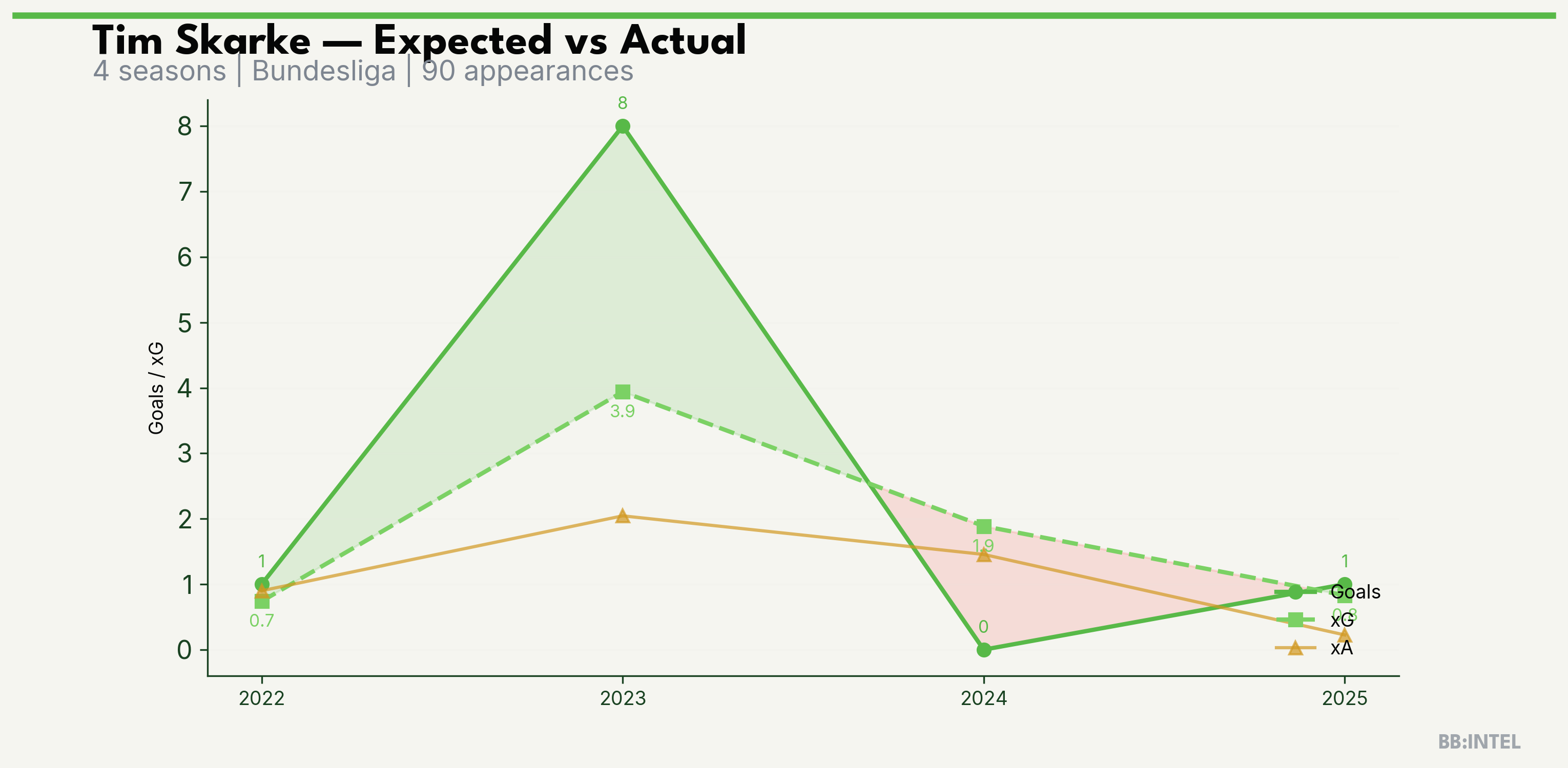 | 2023/2024 | Bundesliga | 30 | 8 | 3.9 | 2.0 | 69 | +4.1 |