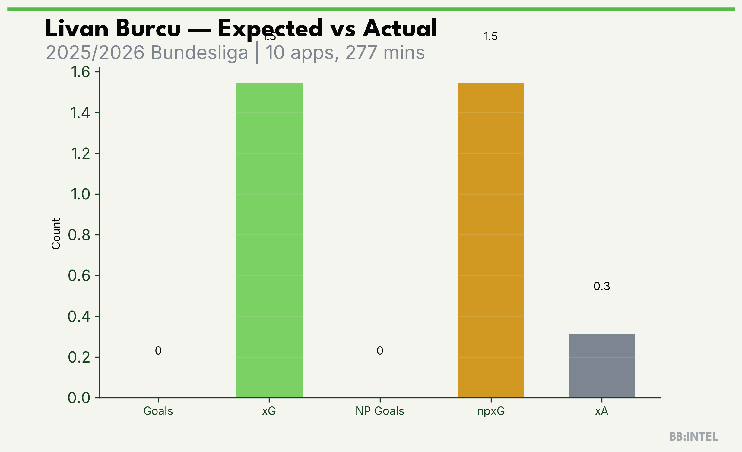 | 2025/2026 | Bundesliga | 10 | 0 | 1.5 | 0.3 | 10 | -1.5 |