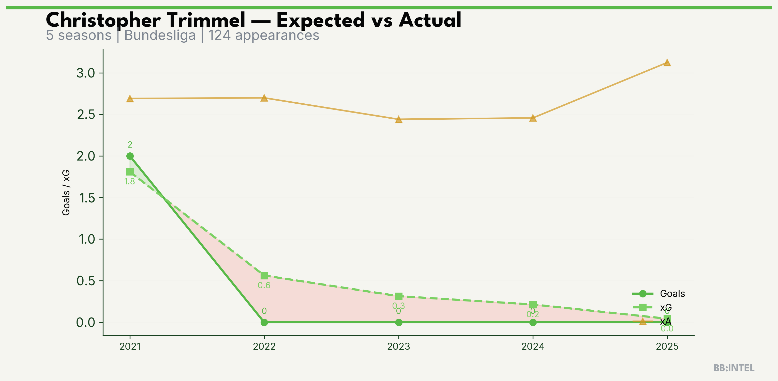 | 2022/2023 | Bundesliga | 25 | 0 | 0.6 | 2.7 | 14 | -0.6 |