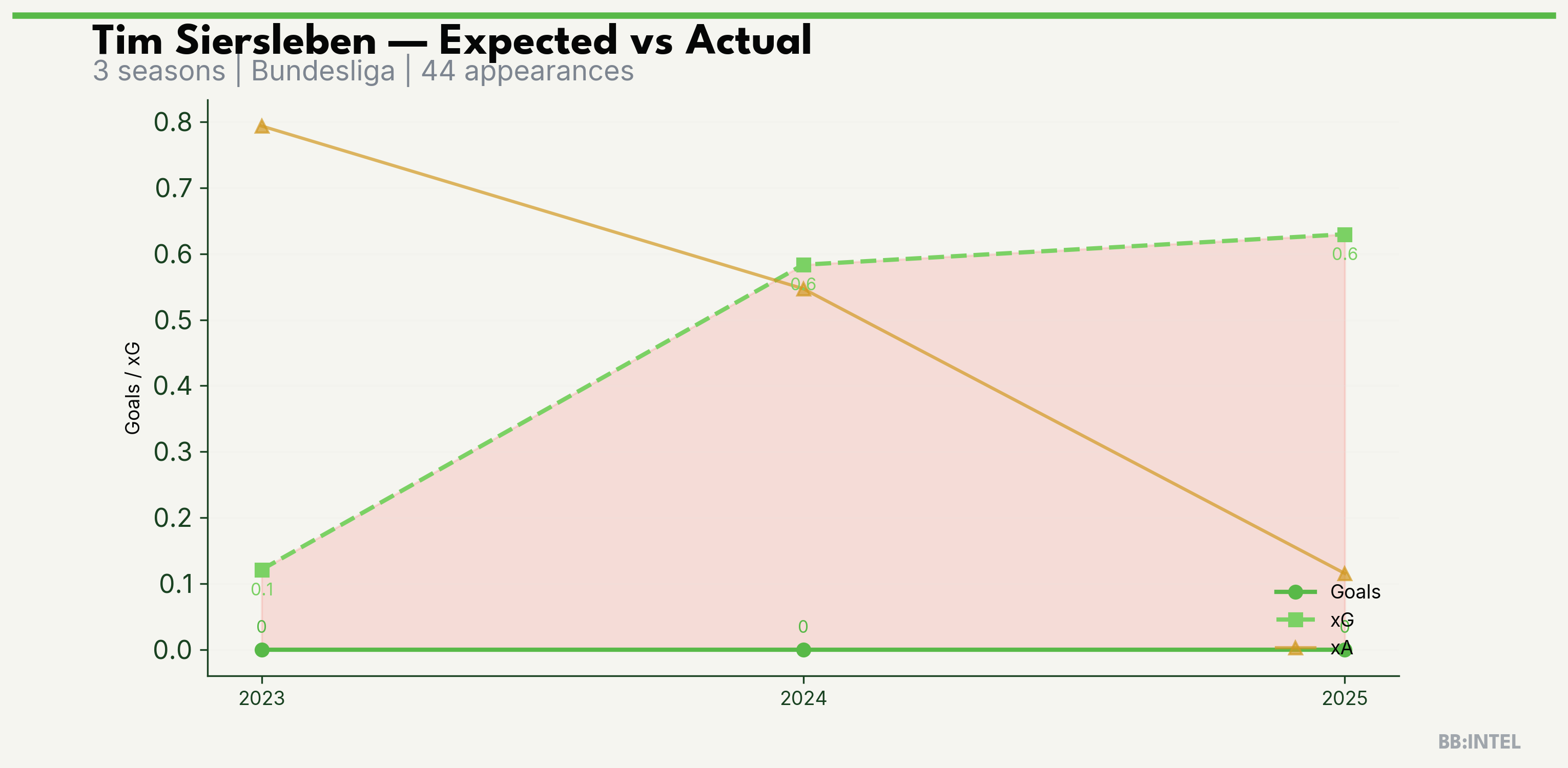 | 2025/2026 | Bundesliga | 14 | 0 | 0.6 | 0.1 | 5 | -0.6 |