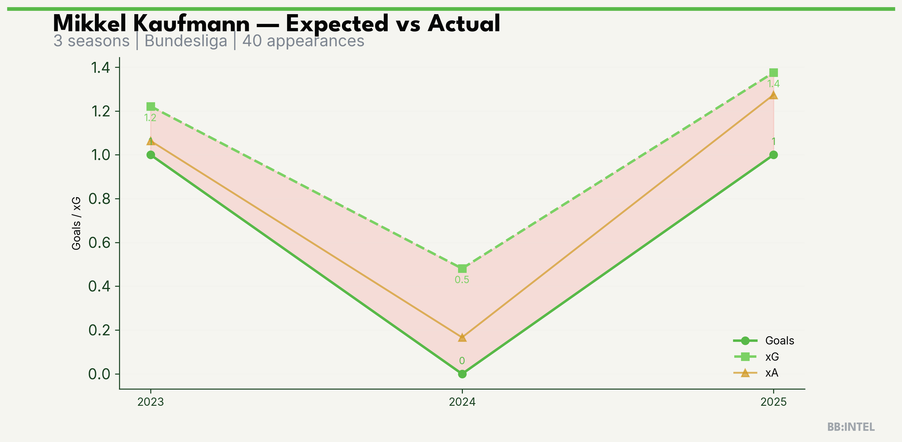 | 2025/2026 | Bundesliga | 13 | 1 | 1.4 | 1.3 | 11 | -0.4 |