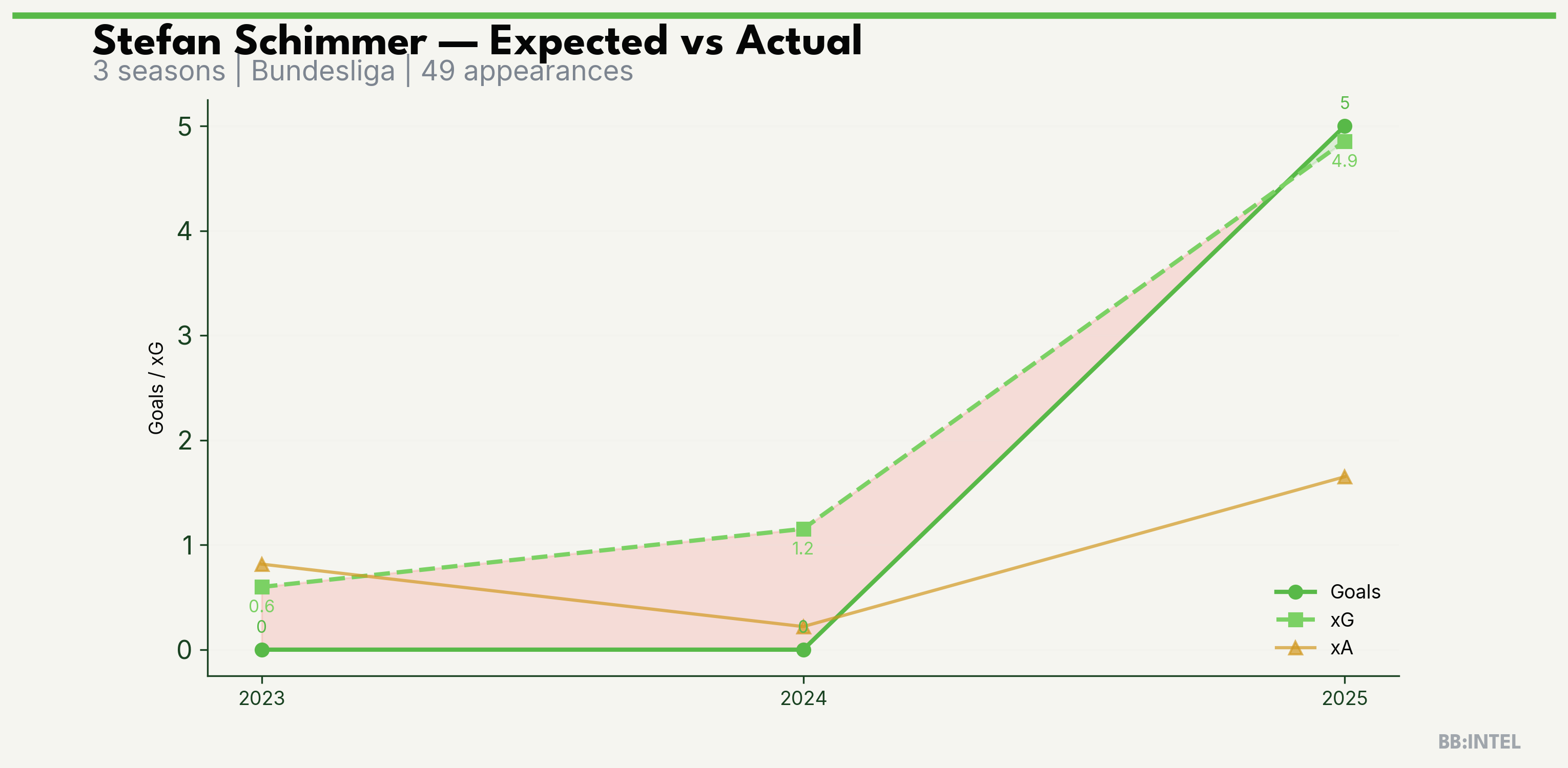 | 2025/2026 | Bundesliga | 20 | 5 | 4.9 | 1.7 | 28 | +0.1 |