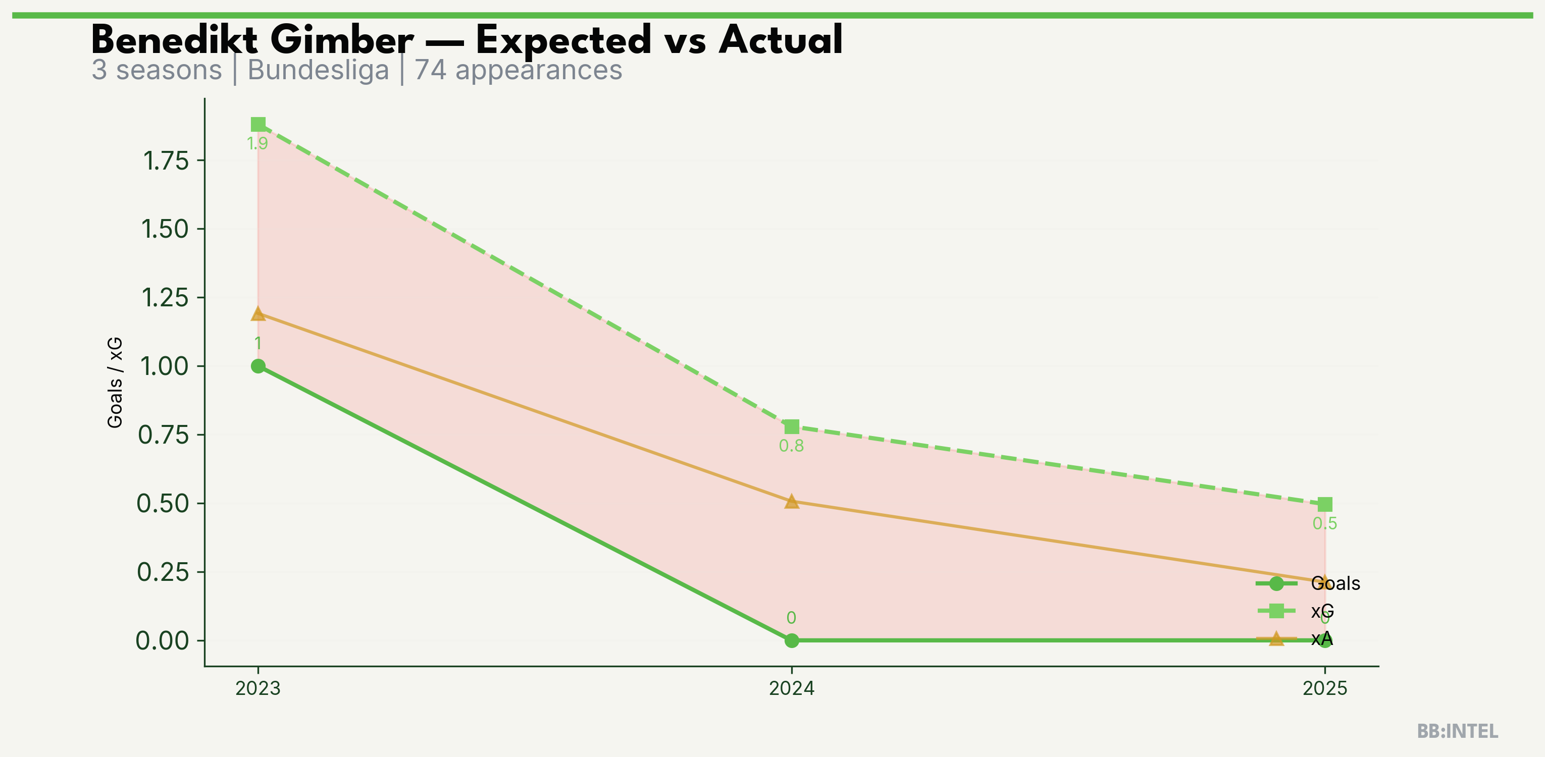 | 2025/2026 | Bundesliga | 18 | 0 | 0.5 | 0.2 | 4 | -0.5 |