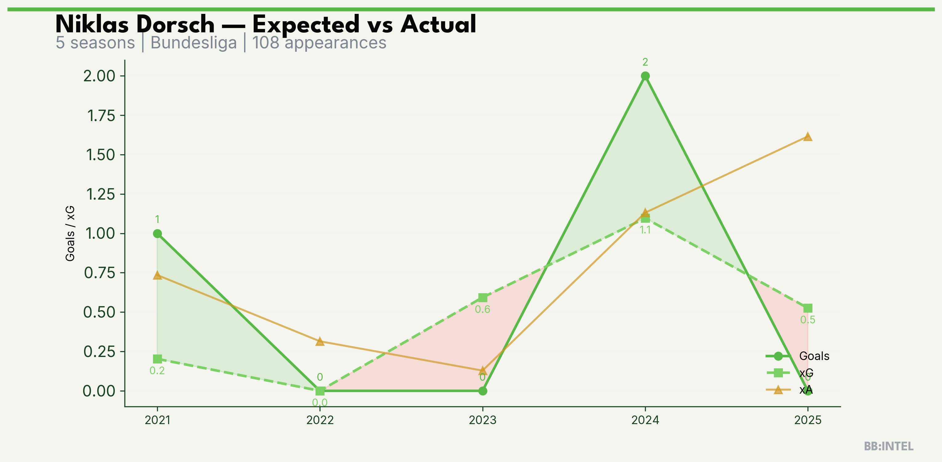 | 2024/2025 | Bundesliga | 23 | 2 | 1.1 | 1.1 | 9 | +0.9 |