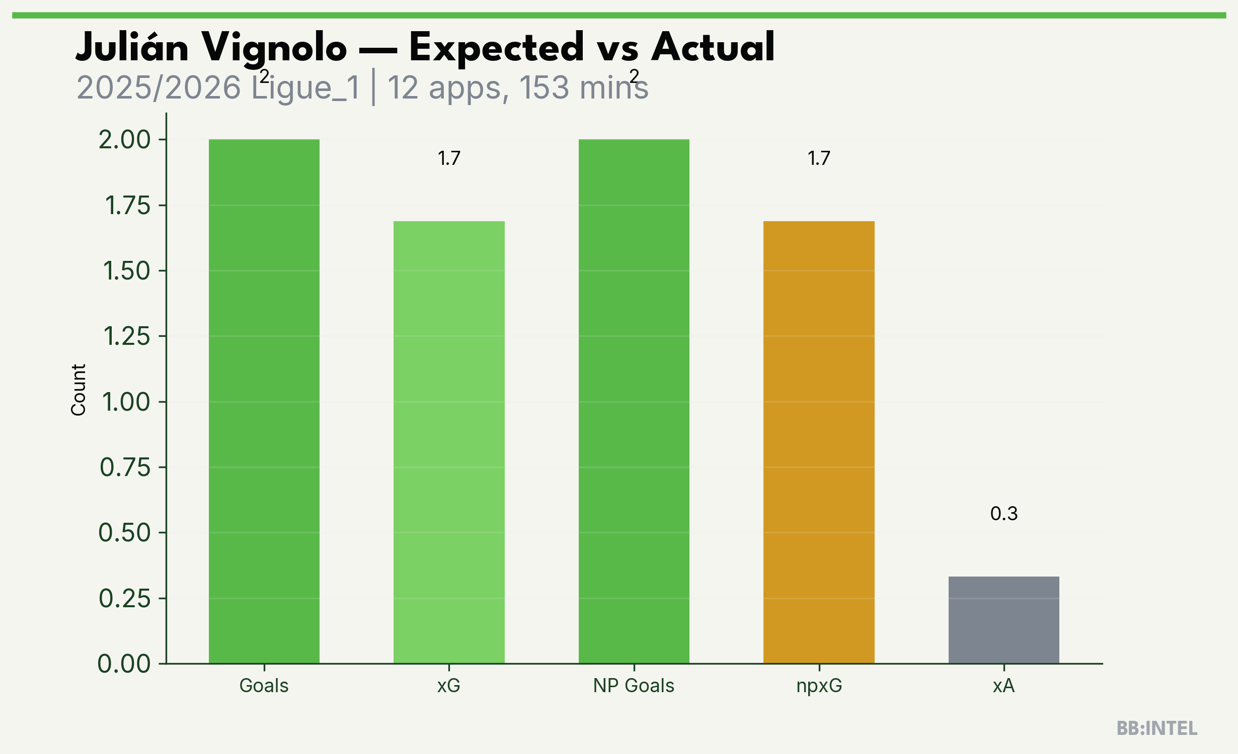 | 2025/2026 | Ligue_1 | 12 | 2 | 1.7 | 0.3 | 8 | +0.3 |