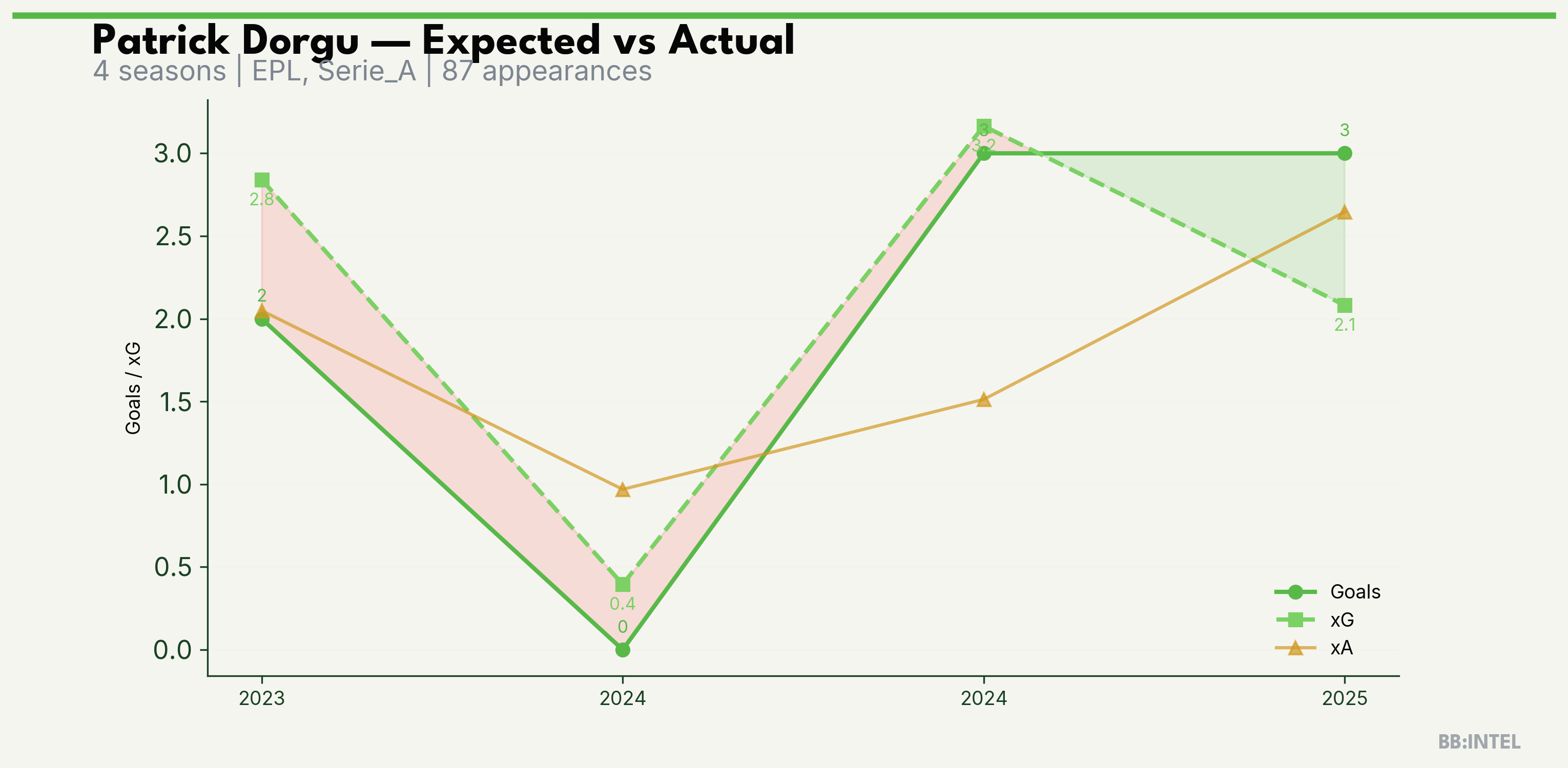 | 2025/2026 | EPL | 22 | 3 | 2.1 | 2.6 | 20 | +0.9 |