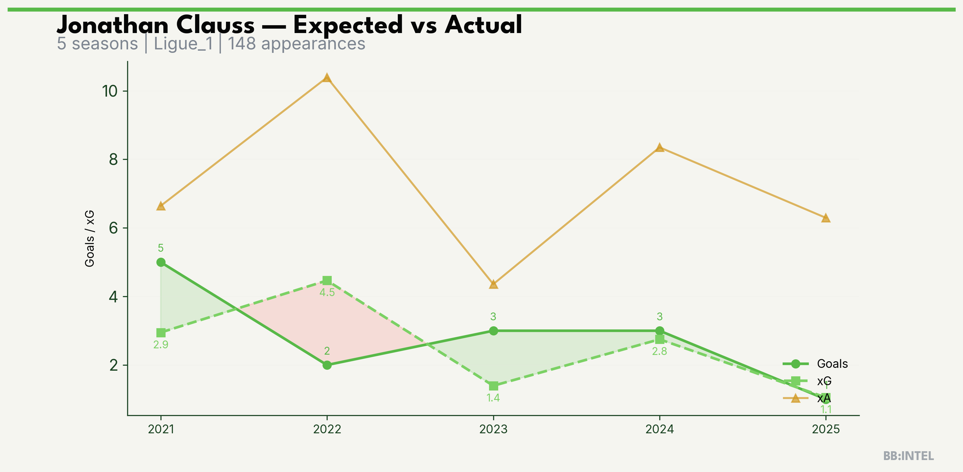 | 2023/2024 | Ligue_1 | 27 | 3 | 1.4 | 4.4 | 28 | +1.6 |