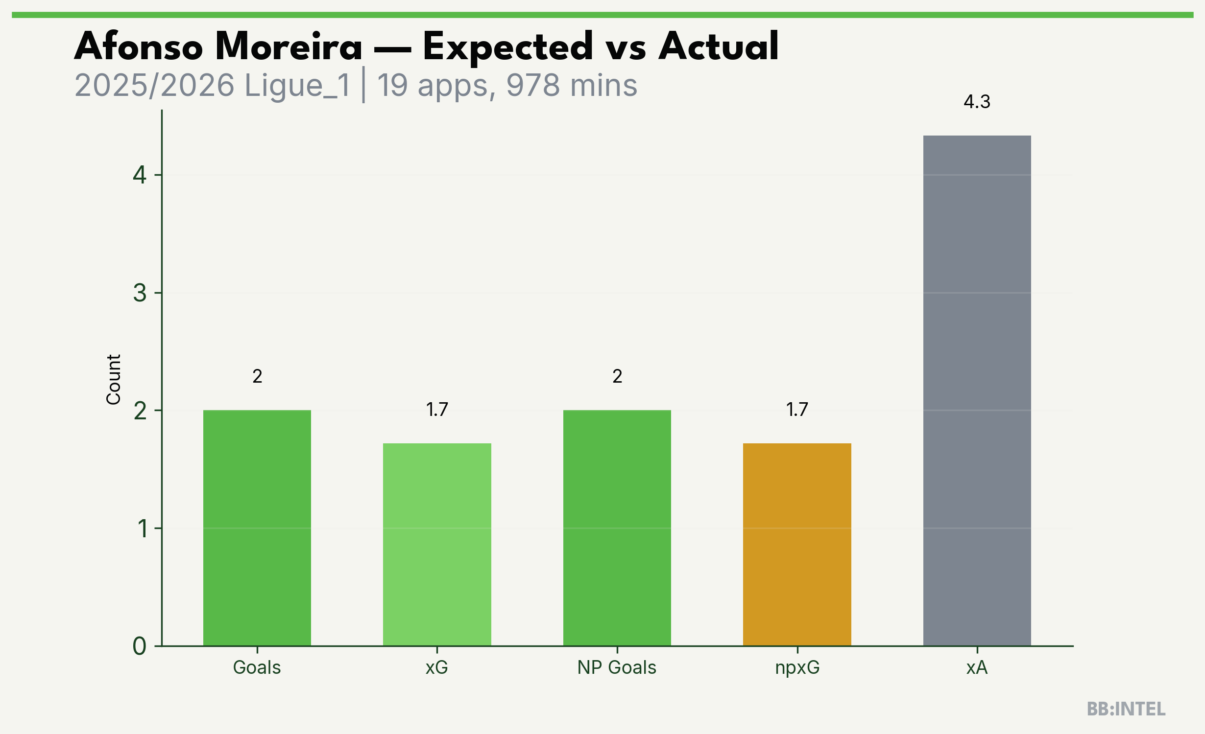 | 2025/2026 | Ligue_1 | 19 | 2 | 1.7 | 4.3 | 23 | +0.3 |
