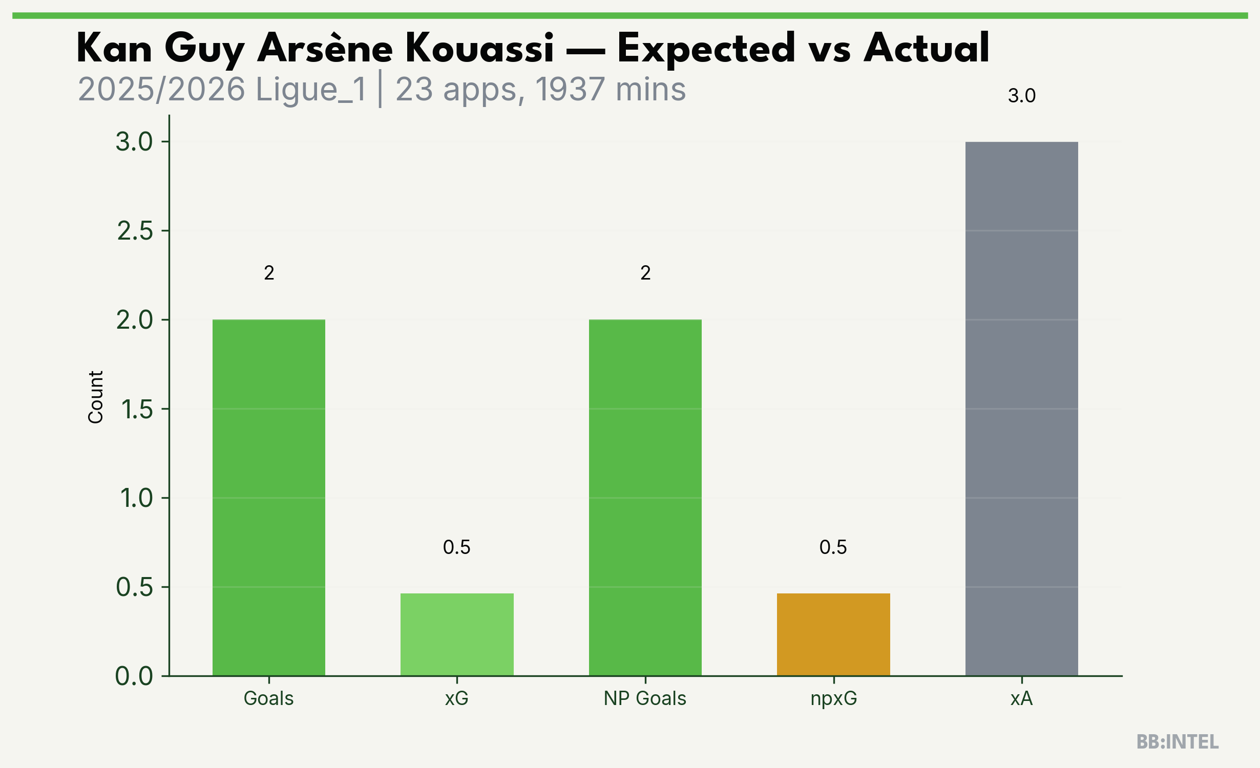 | 2025/2026 | Ligue_1 | 23 | 2 | 0.5 | 3.0 | 5 | +1.5 |