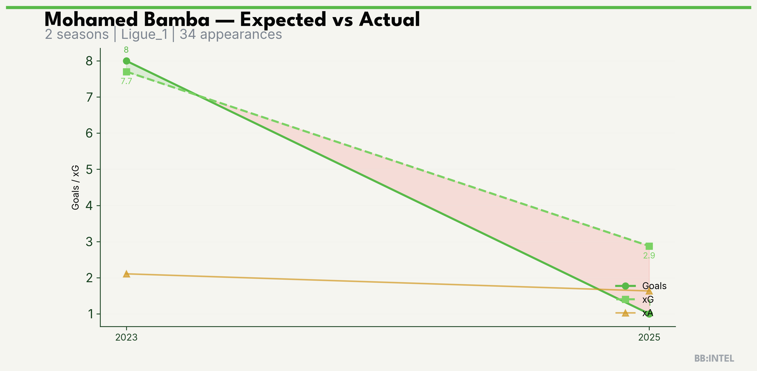 | 2023/2024 | Ligue_1 | 16 | 8 | 7.7 | 2.1 | 38 | +0.3 |