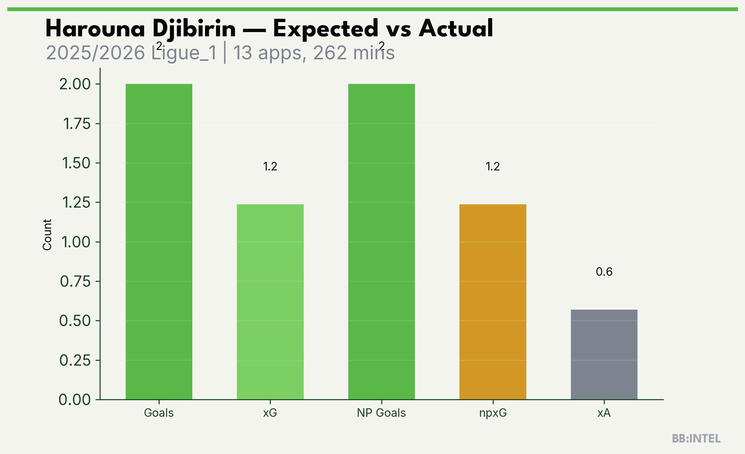 | 2025/2026 | Ligue_1 | 13 | 2 | 1.2 | 0.6 | 6 | +0.8 |