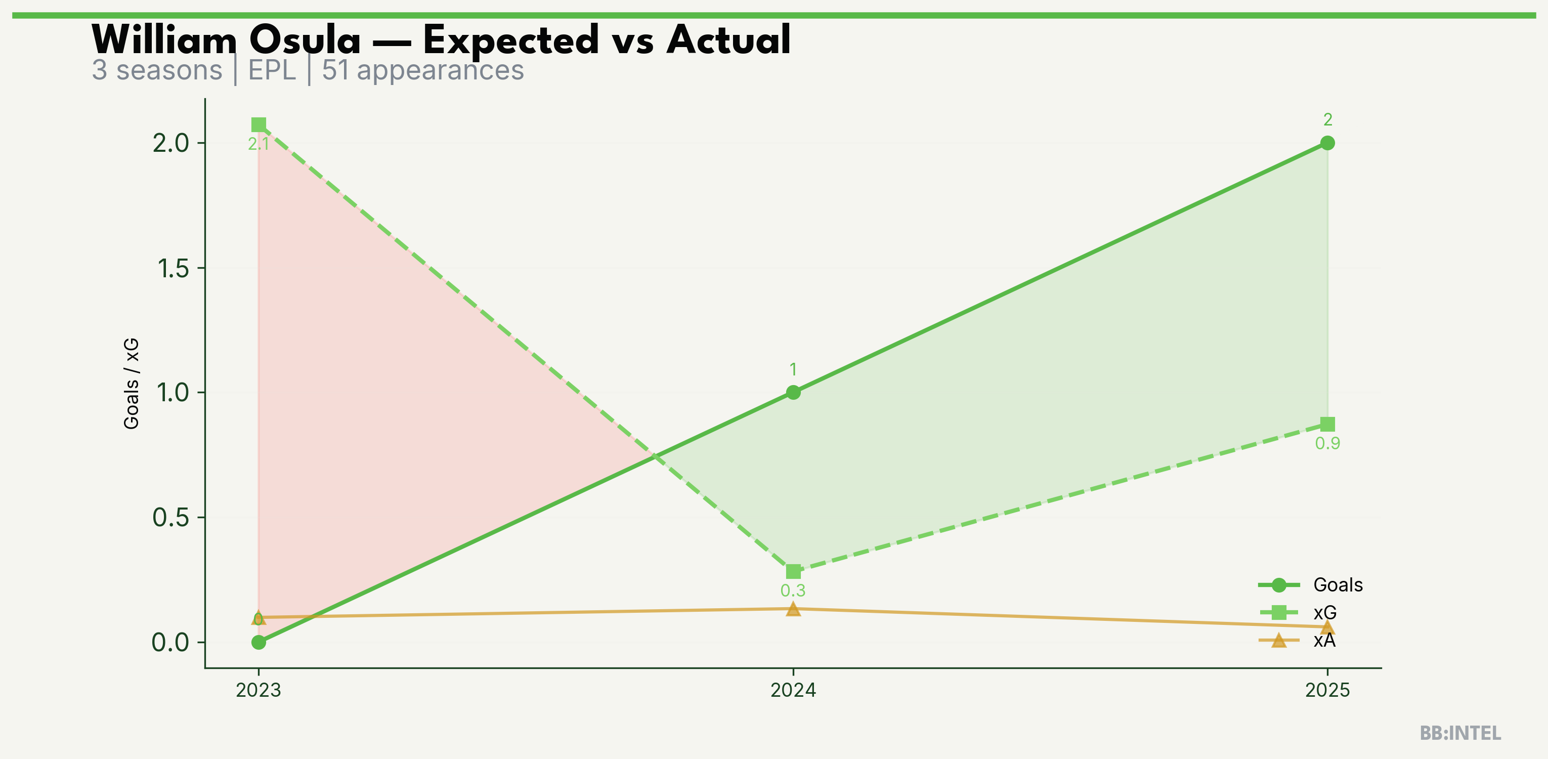 | 2025/2026 | EPL | 16 | 2 | 0.9 | 0.1 | 8 | +1.1 |
