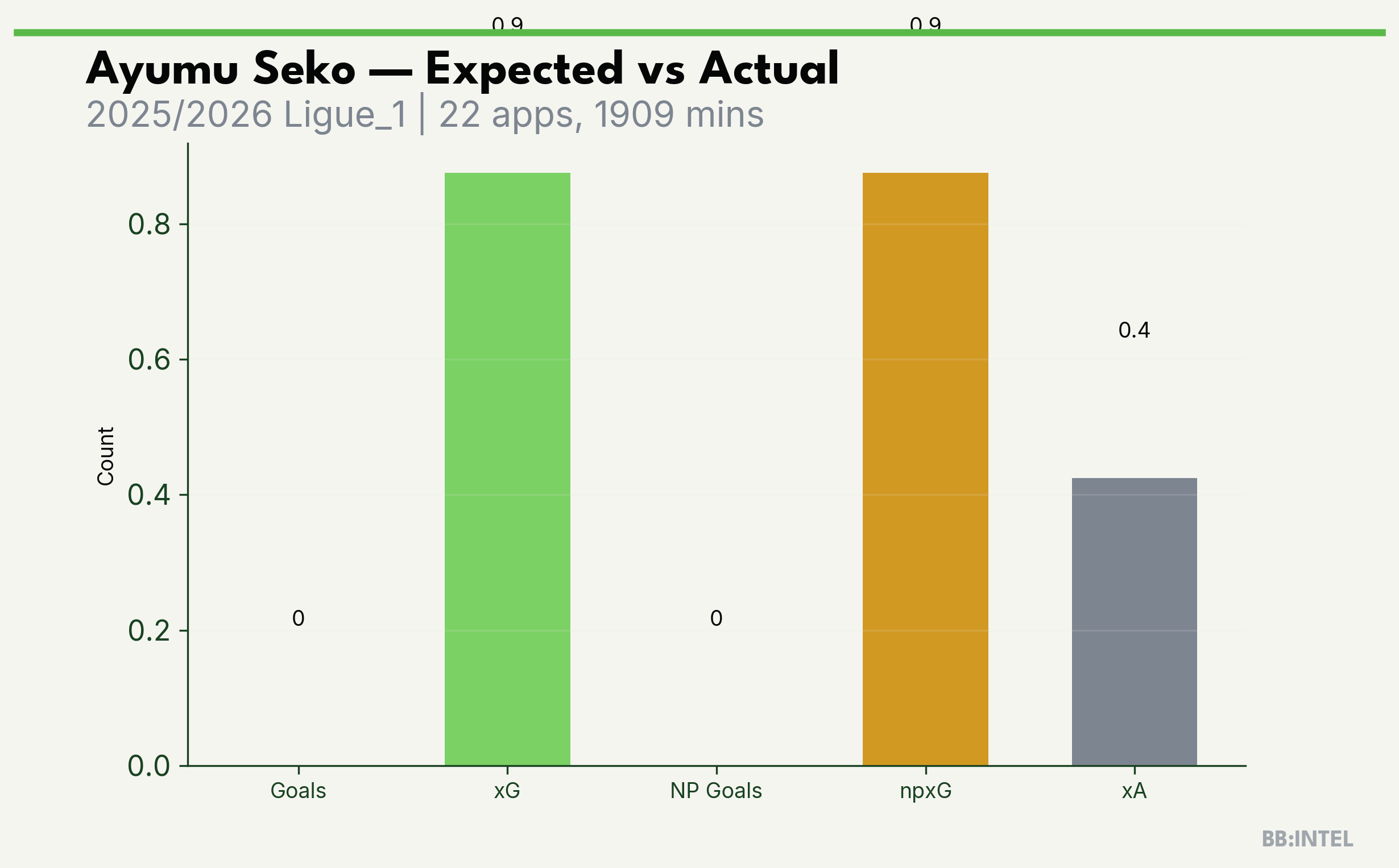 | 2025/2026 | Ligue_1 | 22 | 0 | 0.9 | 0.4 | 14 | -0.9 |