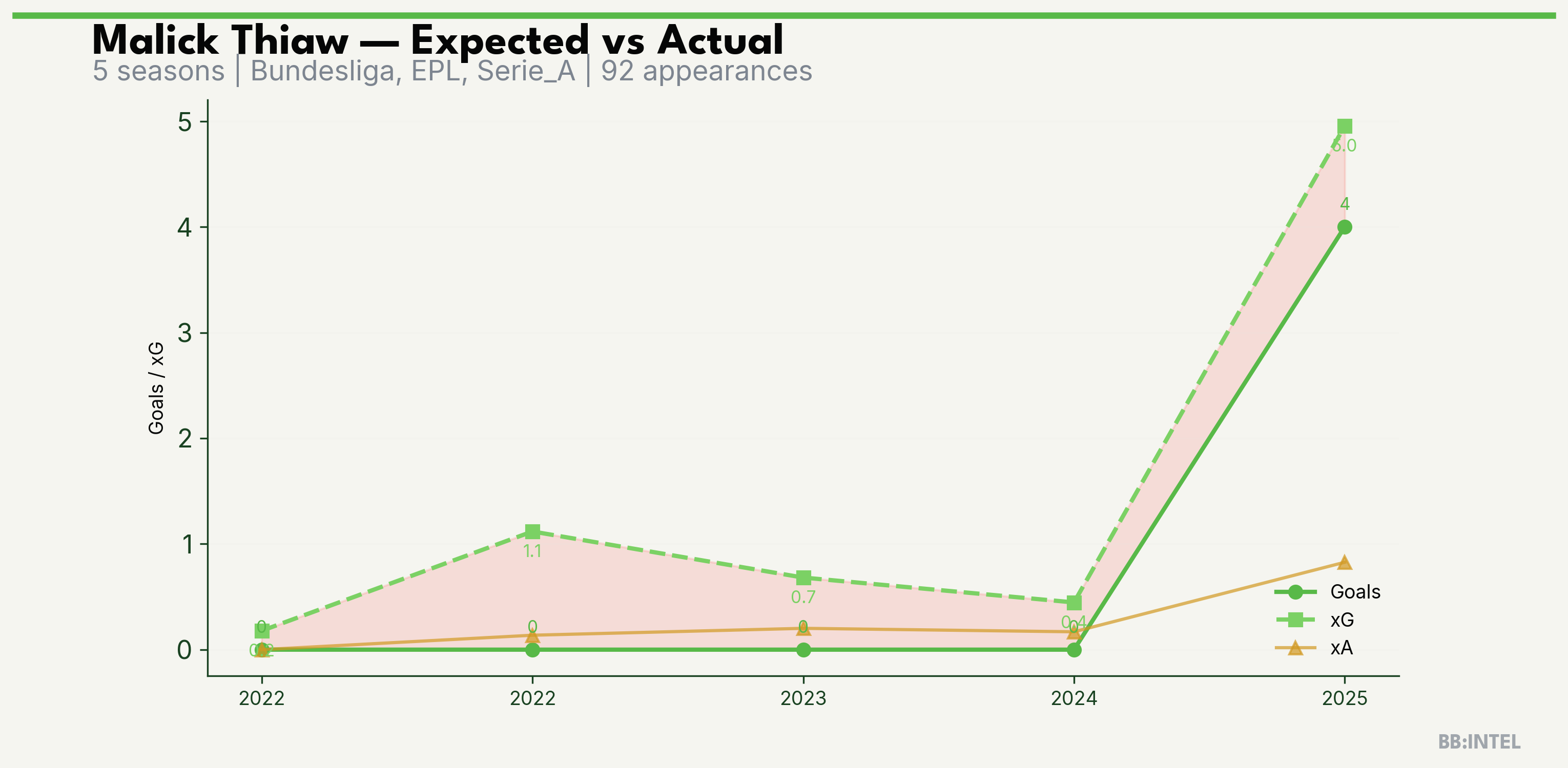 | 2025/2026 | EPL | 26 | 4 | 5.0 | 0.8 | 24 | -1.0 |