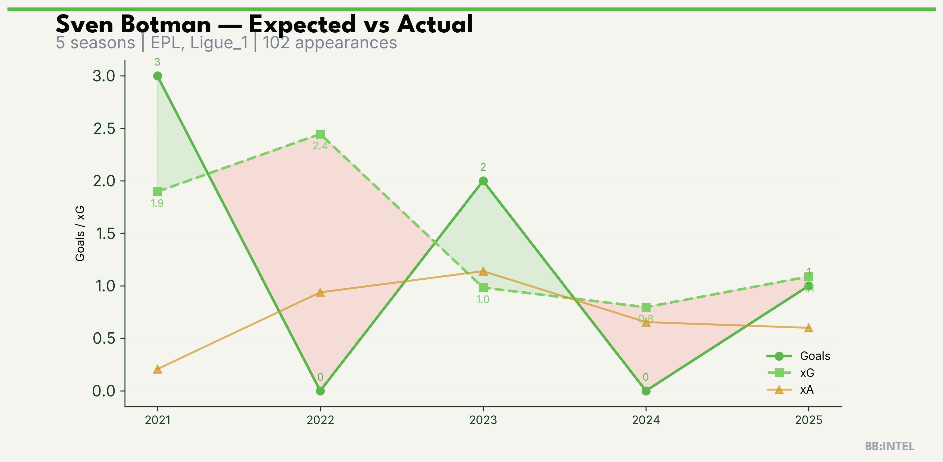 | 2025/2026 | EPL | 16 | 1 | 1.1 | 0.6 | 8 | -0.1 |