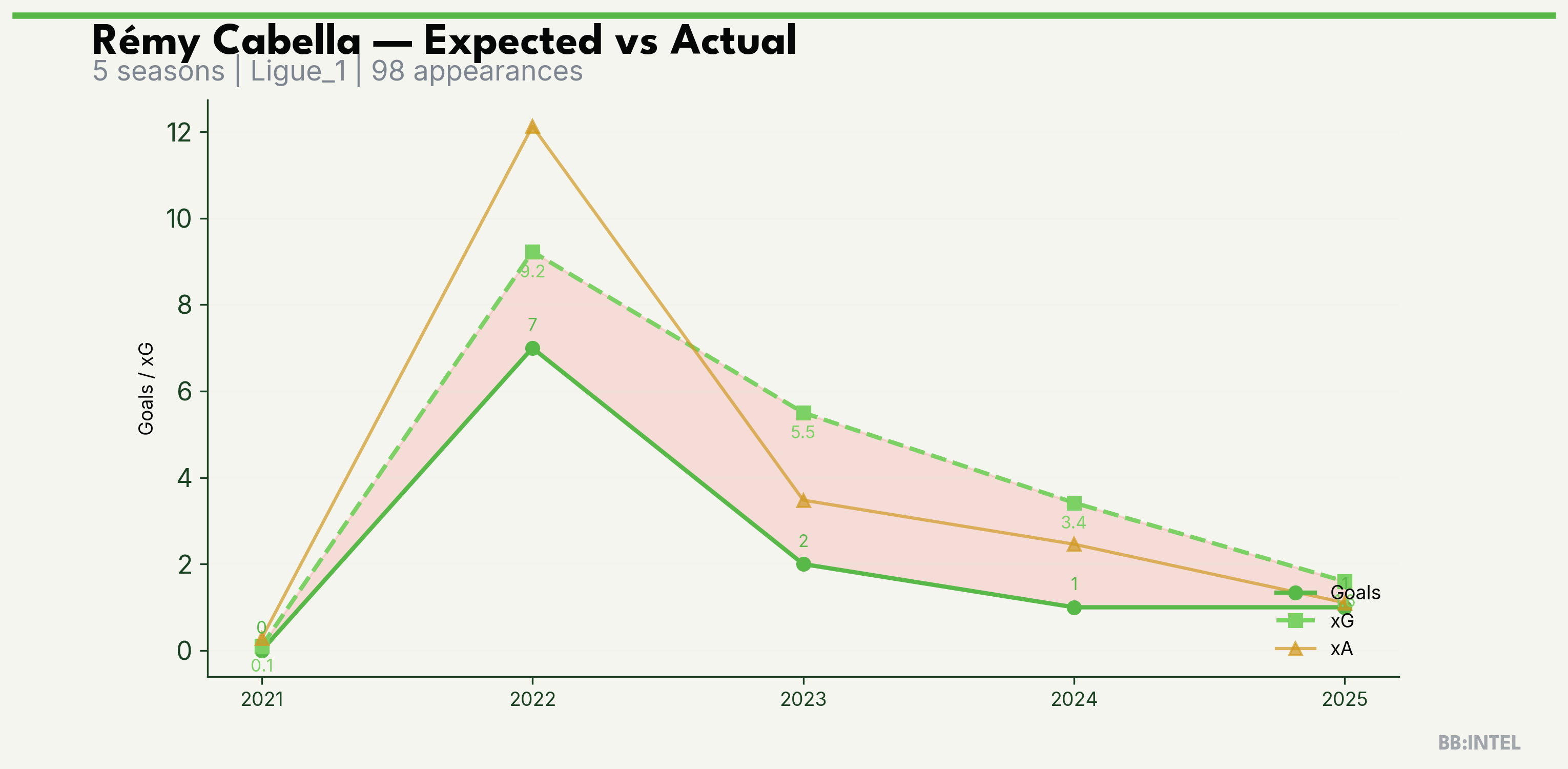 | 2022/2023 | Ligue_1 | 32 | 7 | 9.2 | 12.1 | 42 | -2.2 |