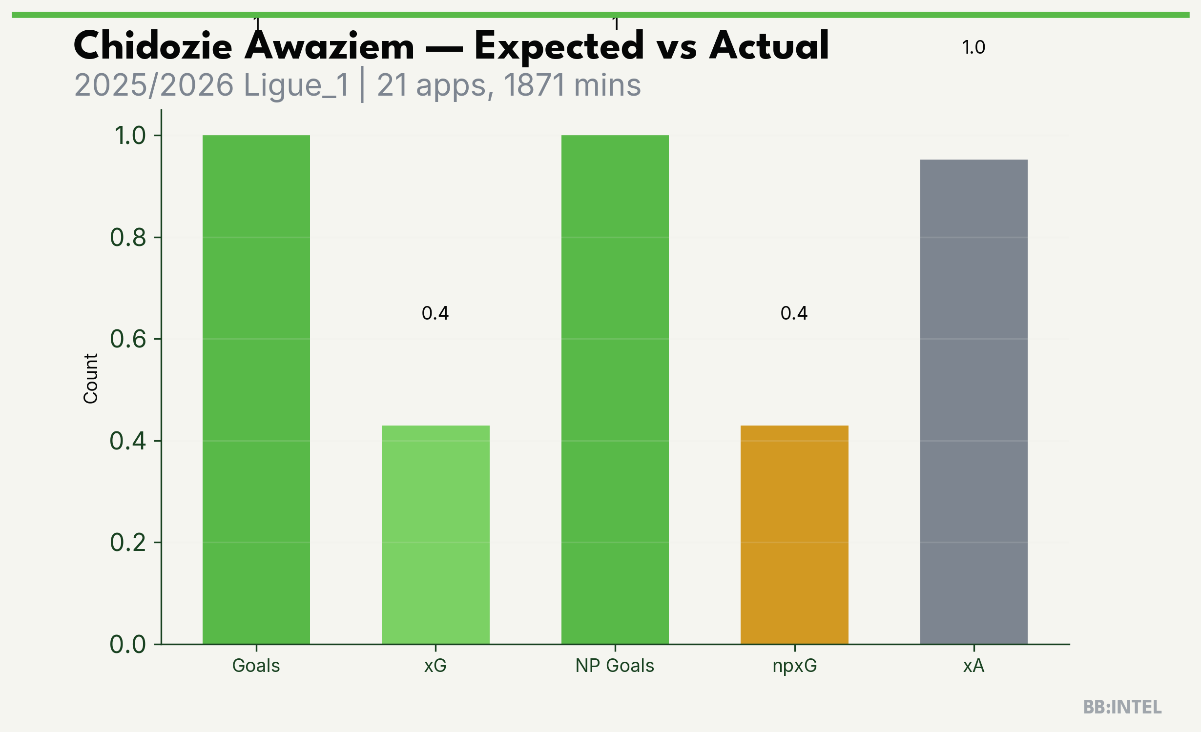 | 2025/2026 | Ligue_1 | 21 | 1 | 0.4 | 1.0 | 9 | +0.6 |