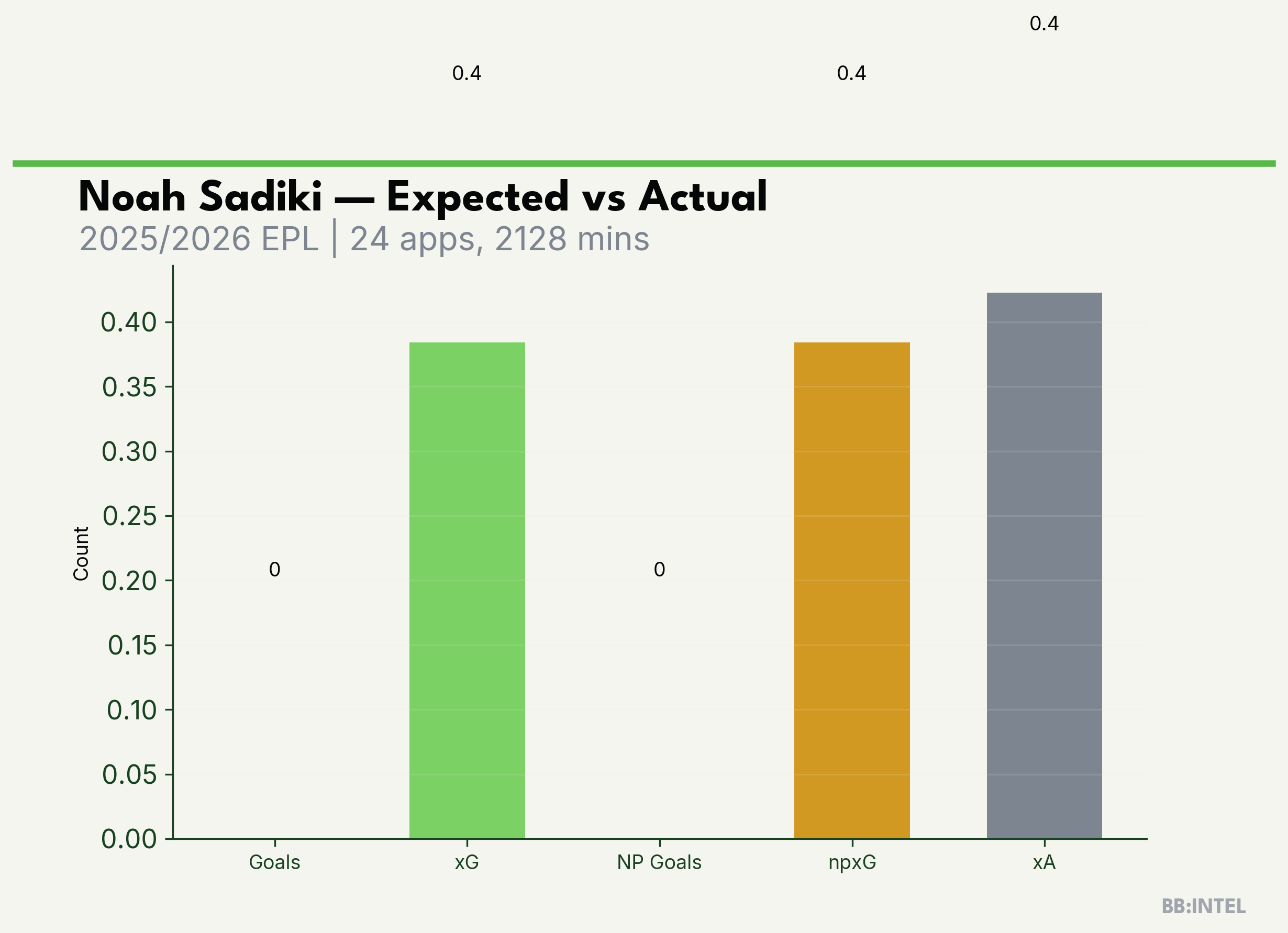 | 2025/2026 | EPL | 24 | 0 | 0.4 | 0.4 | 10 | -0.4 |