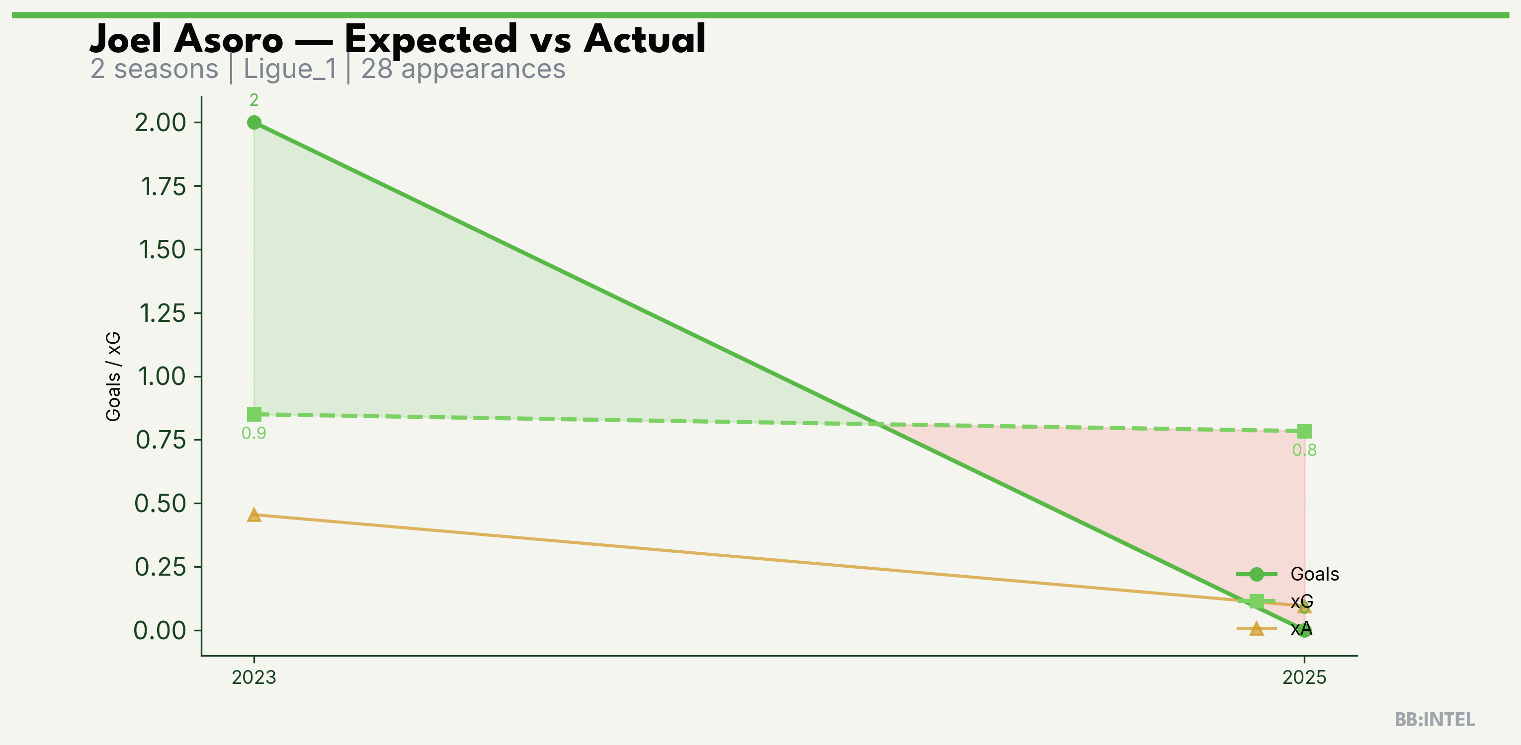 | 2023/2024 | Ligue_1 | 20 | 2 | 0.9 | 0.5 | 6 | +1.1 |