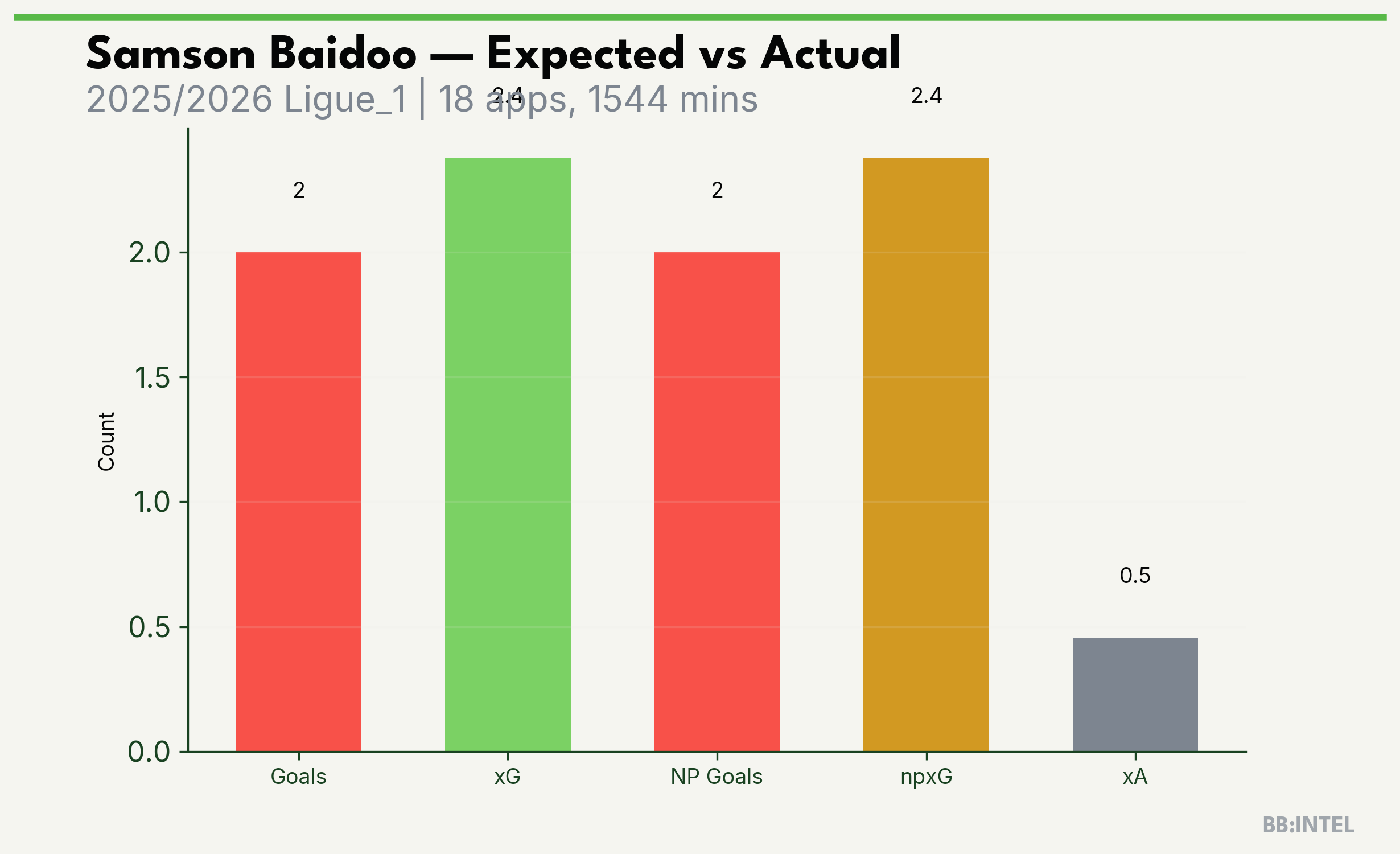 | 2025/2026 | Ligue_1 | 18 | 2 | 2.4 | 0.5 | 15 | -0.4 |