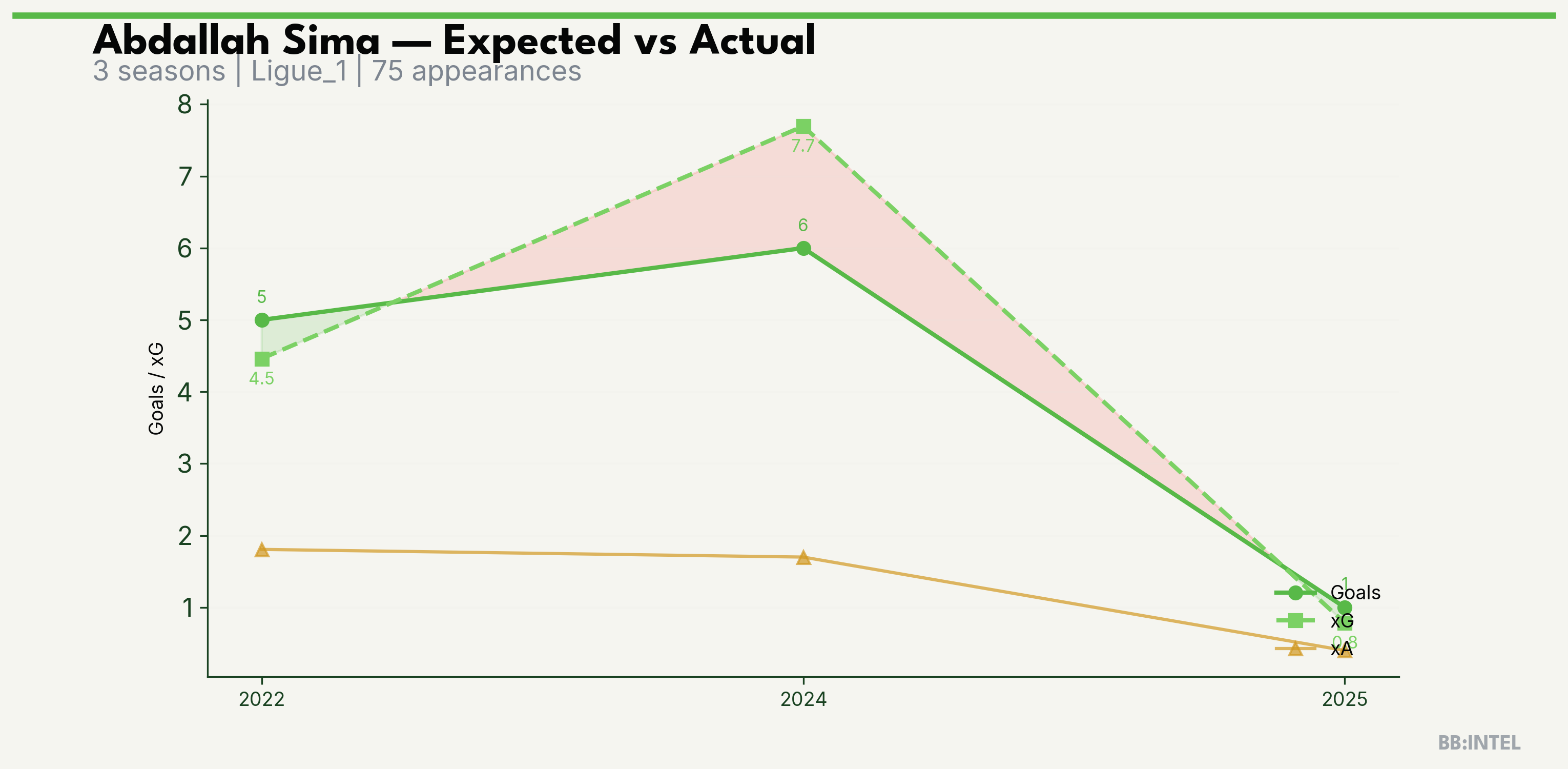 | 2022/2023 | Ligue_1 | 34 | 5 | 4.5 | 1.8 | 39 | +0.5 |