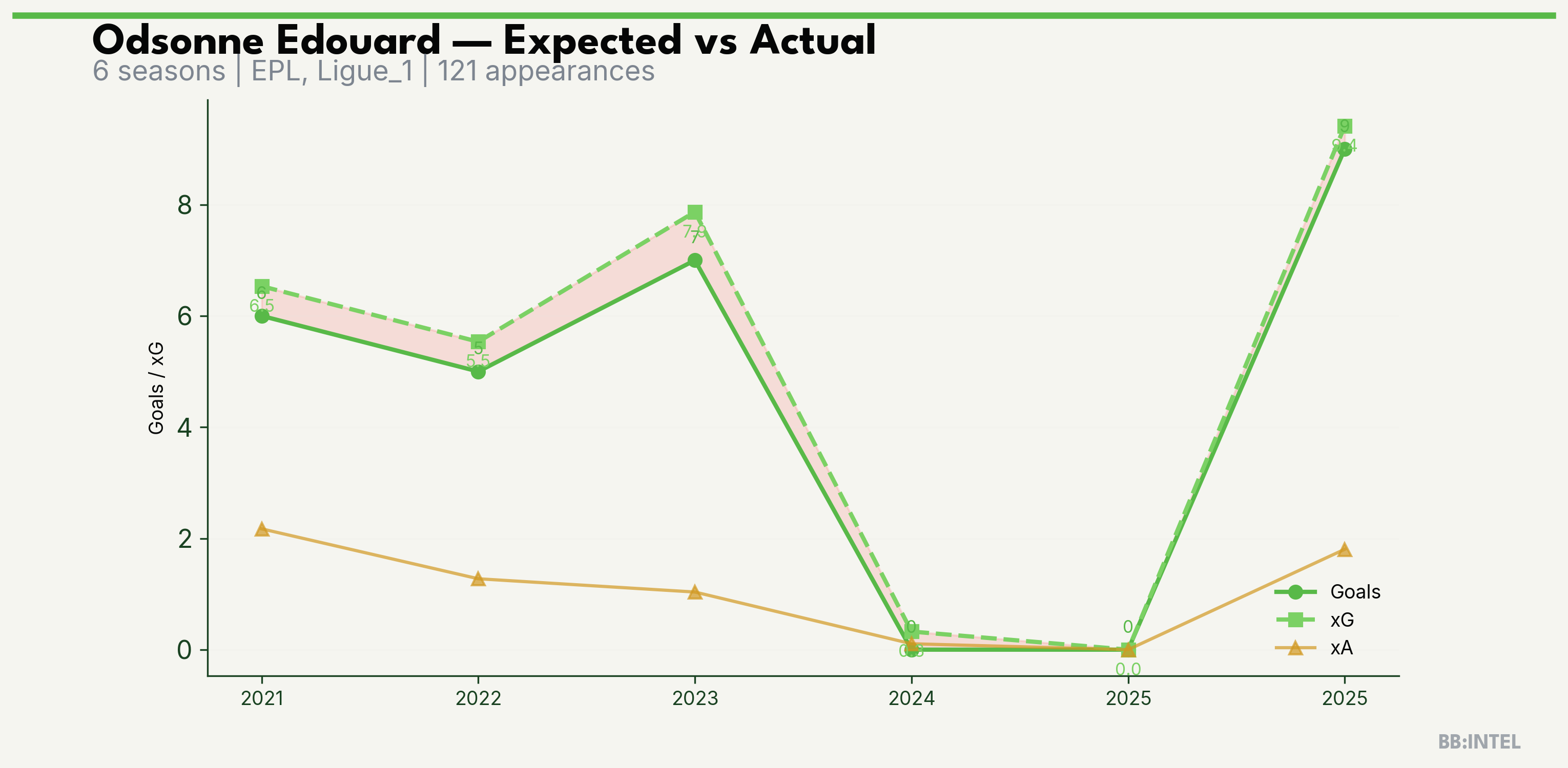 | 2024/2025 | EPL | 6 | 0 | 0.3 | 0.1 | 5 | -0.3 |