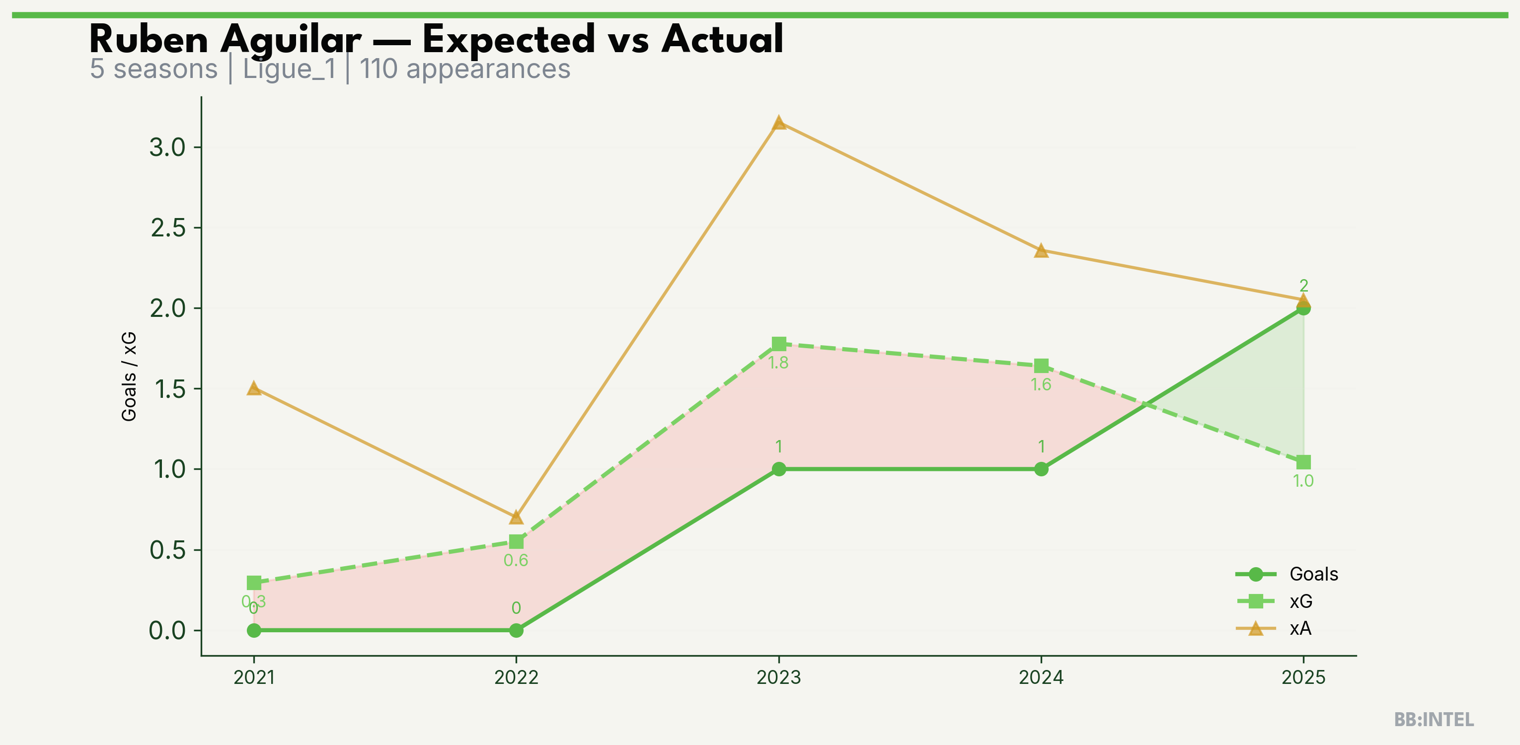 | 2025/2026 | Ligue_1 | 21 | 2 | 1.0 | 2.1 | 13 | +1.0 |