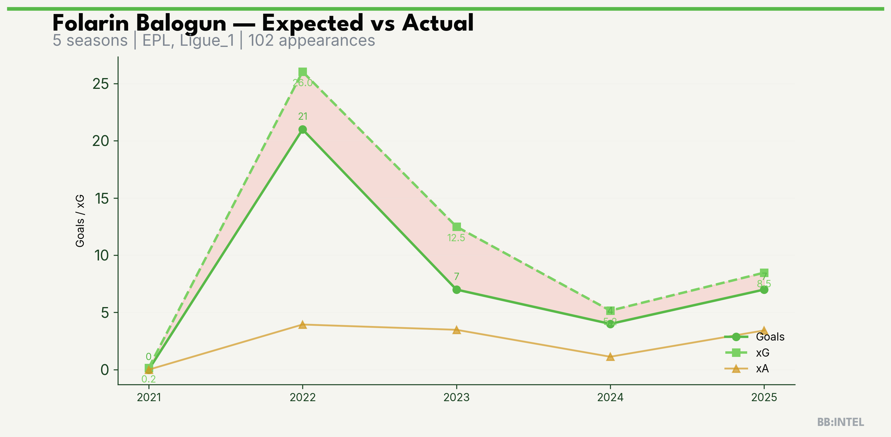 | 2022/2023 | Ligue_1 | 37 | 21 | 26.0 | 3.9 | 128 | -5.0 |