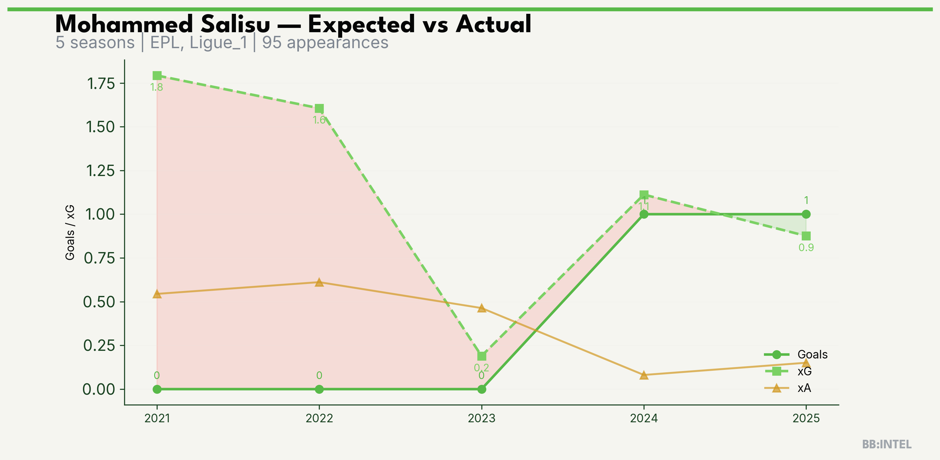 | 2022/2023 | EPL | 22 | 0 | 1.6 | 0.6 | 19 | -1.6 |