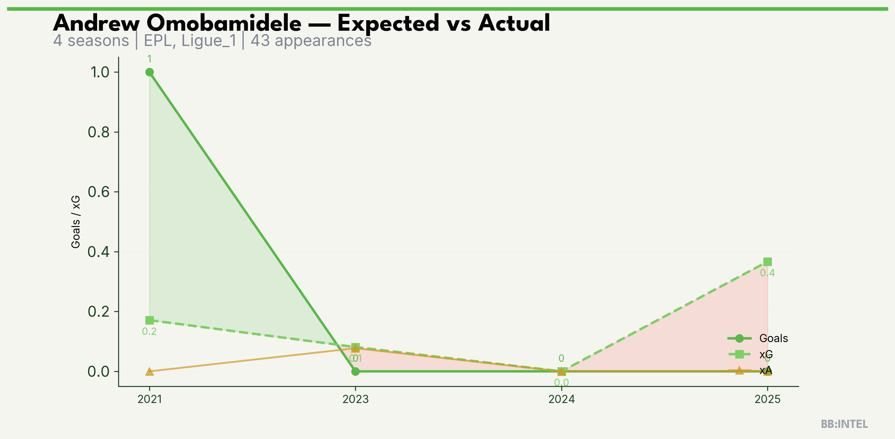 | 2021/2022 | EPL | 5 | 1 | 0.2 | 0.0 | 2 | +0.8 |