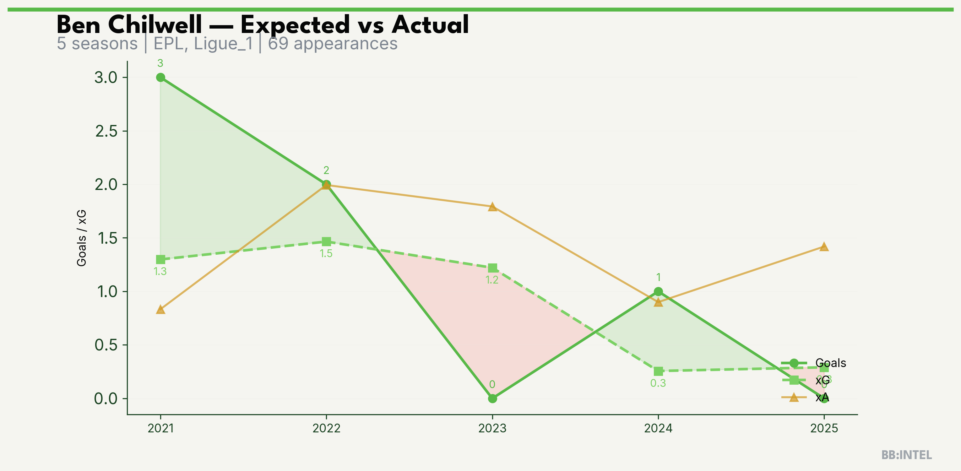 | 2024/2025 | EPL | 8 | 1 | 0.3 | 0.9 | 5 | +0.7 |