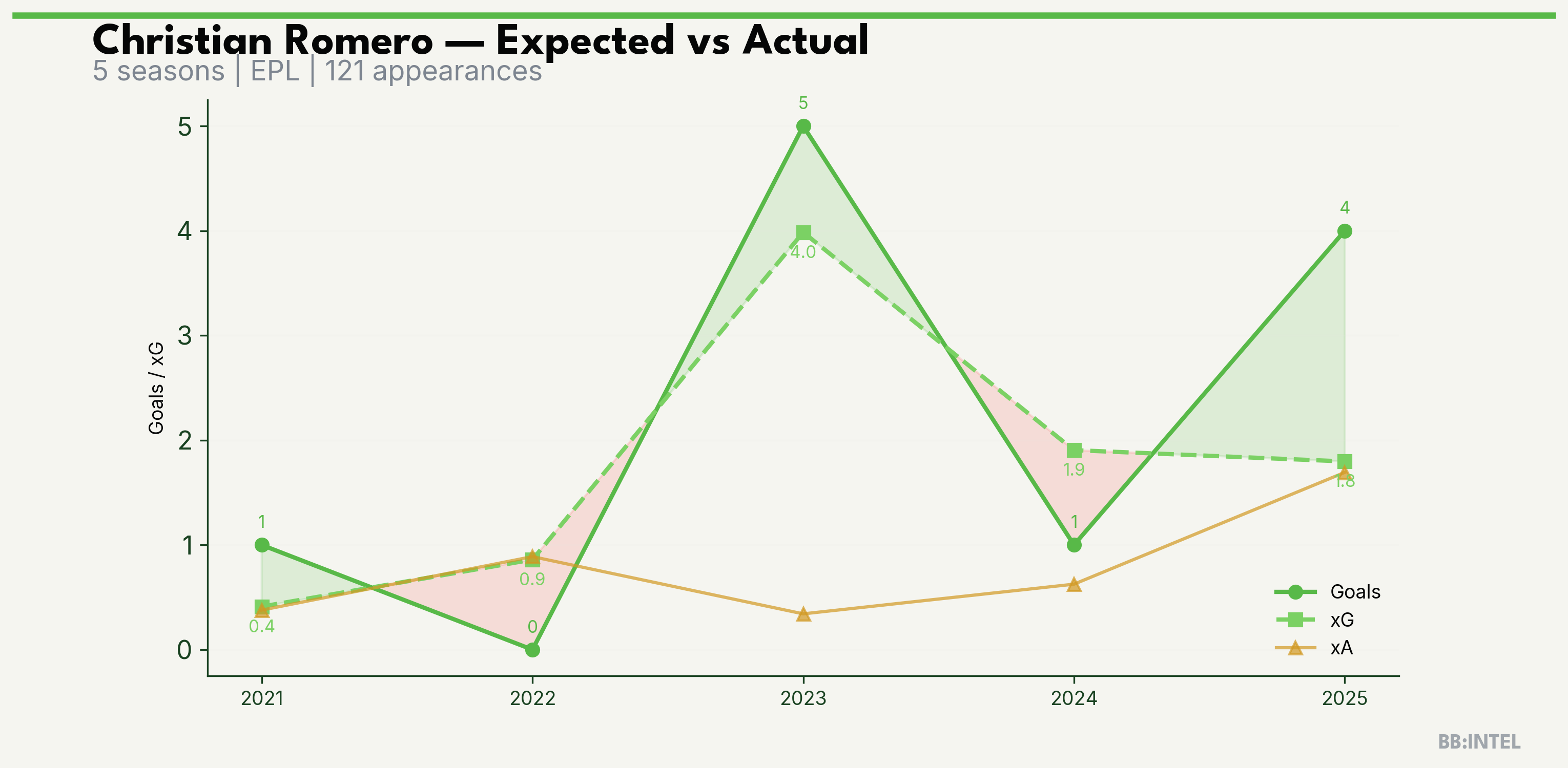 | 2025/2026 | EPL | 21 | 4 | 1.8 | 1.7 | 15 | +2.2 |