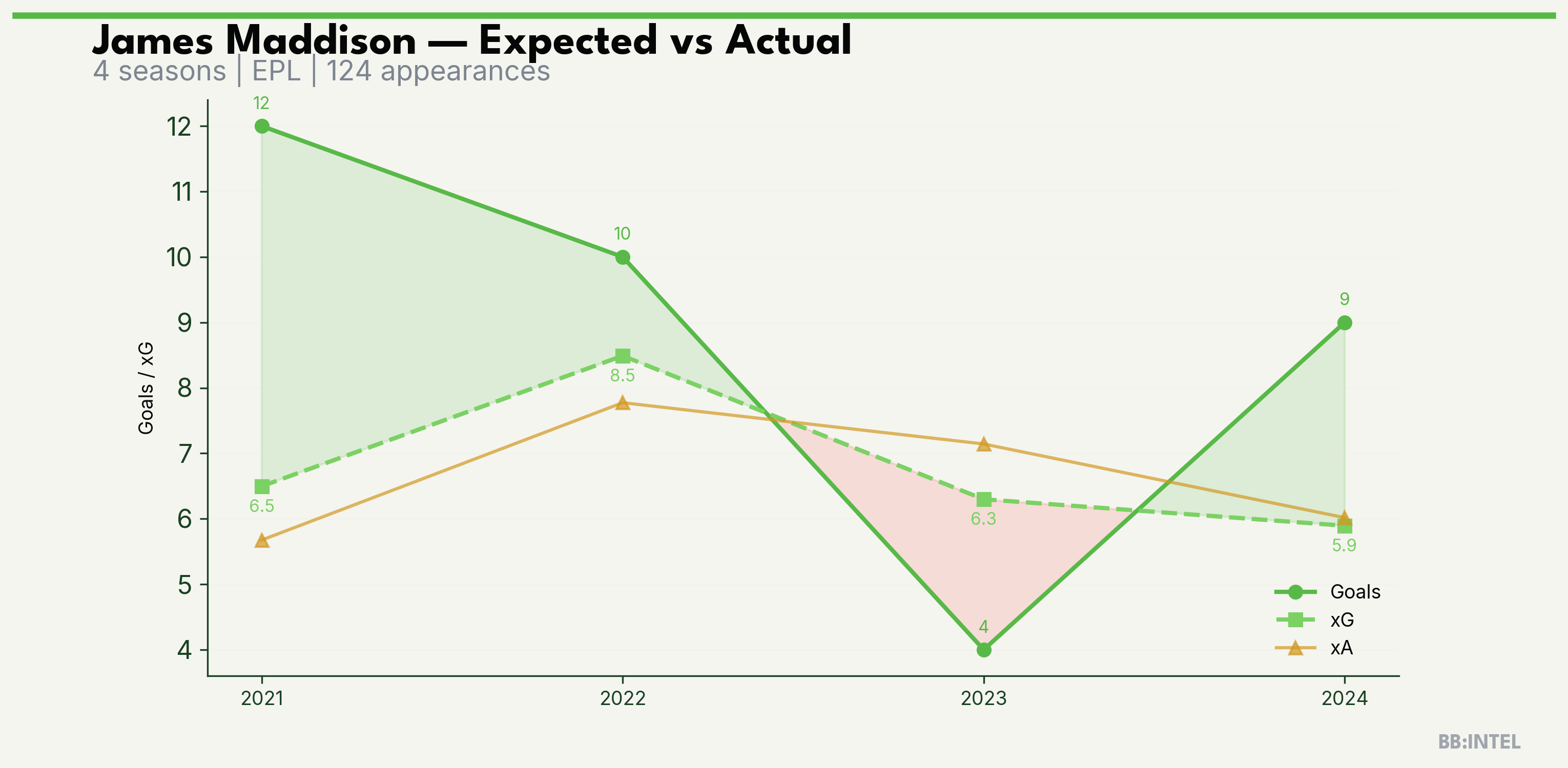 | 2024/2025 | EPL | 31 | 9 | 5.9 | 6.0 | 39 | +3.1 |