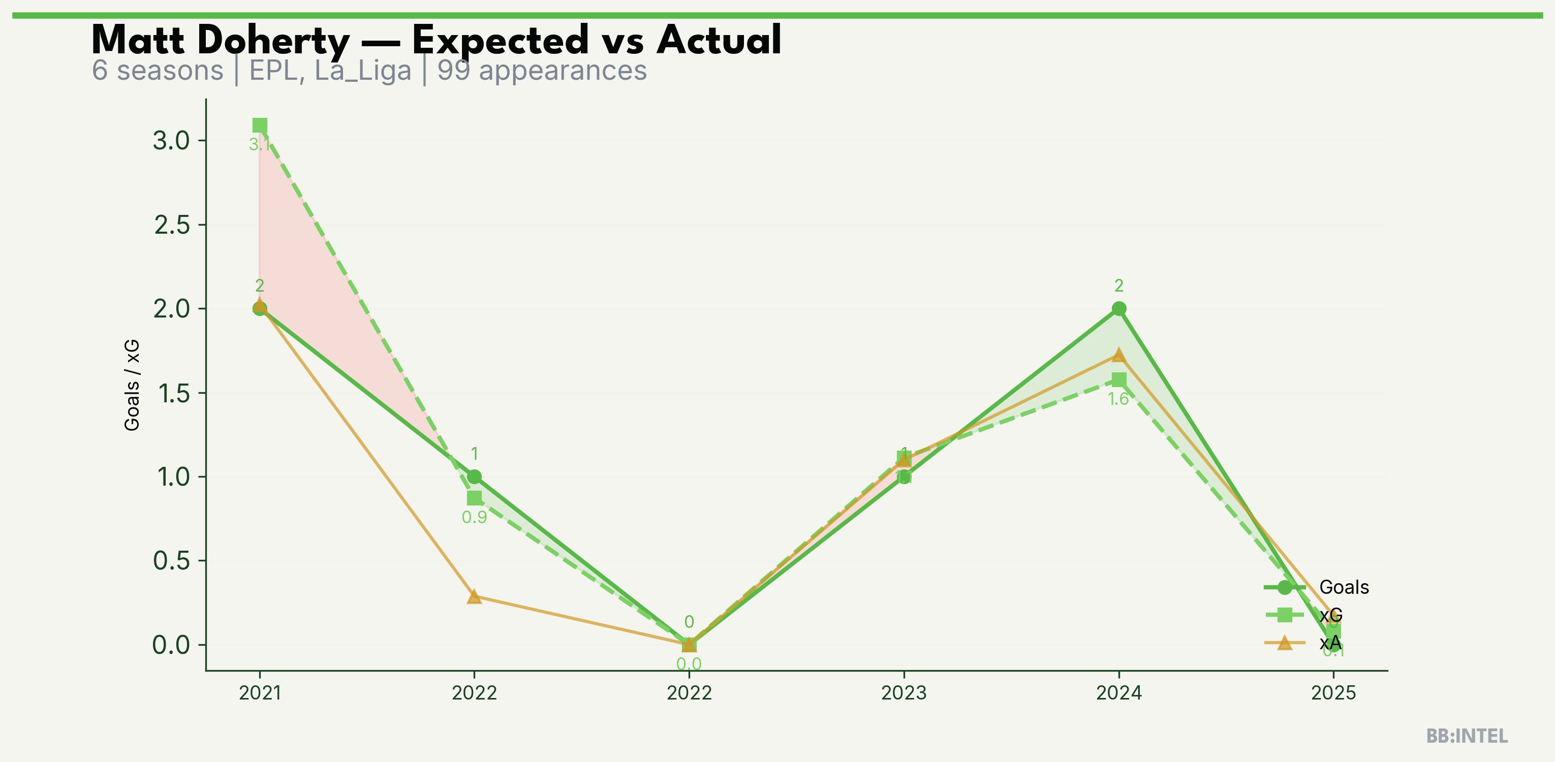 | 2024/2025 | EPL | 30 | 2 | 1.6 | 1.7 | 10 | +0.4 |