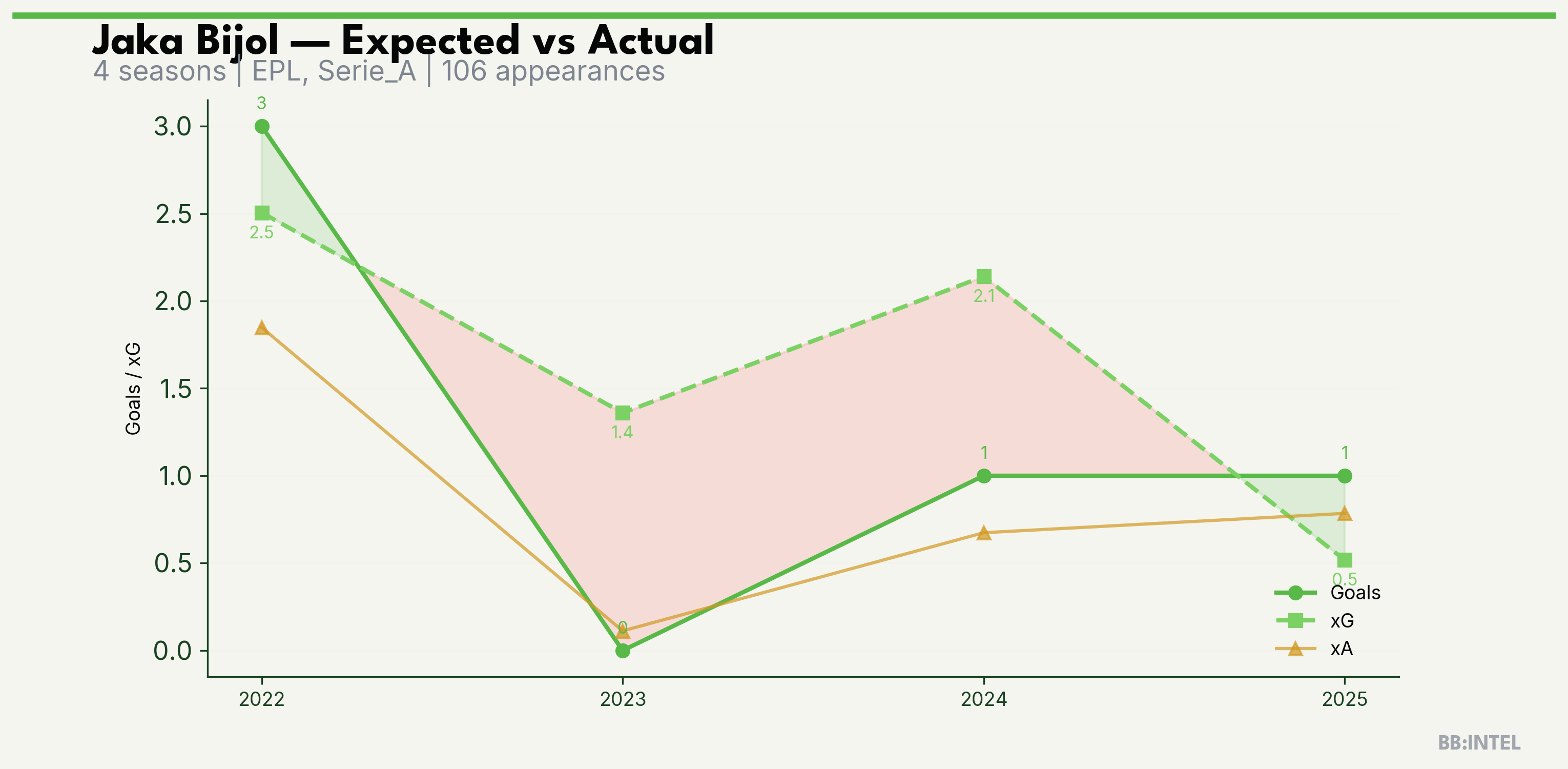 | 2025/2026 | EPL | 16 | 1 | 0.5 | 0.8 | 10 | +0.5 |
