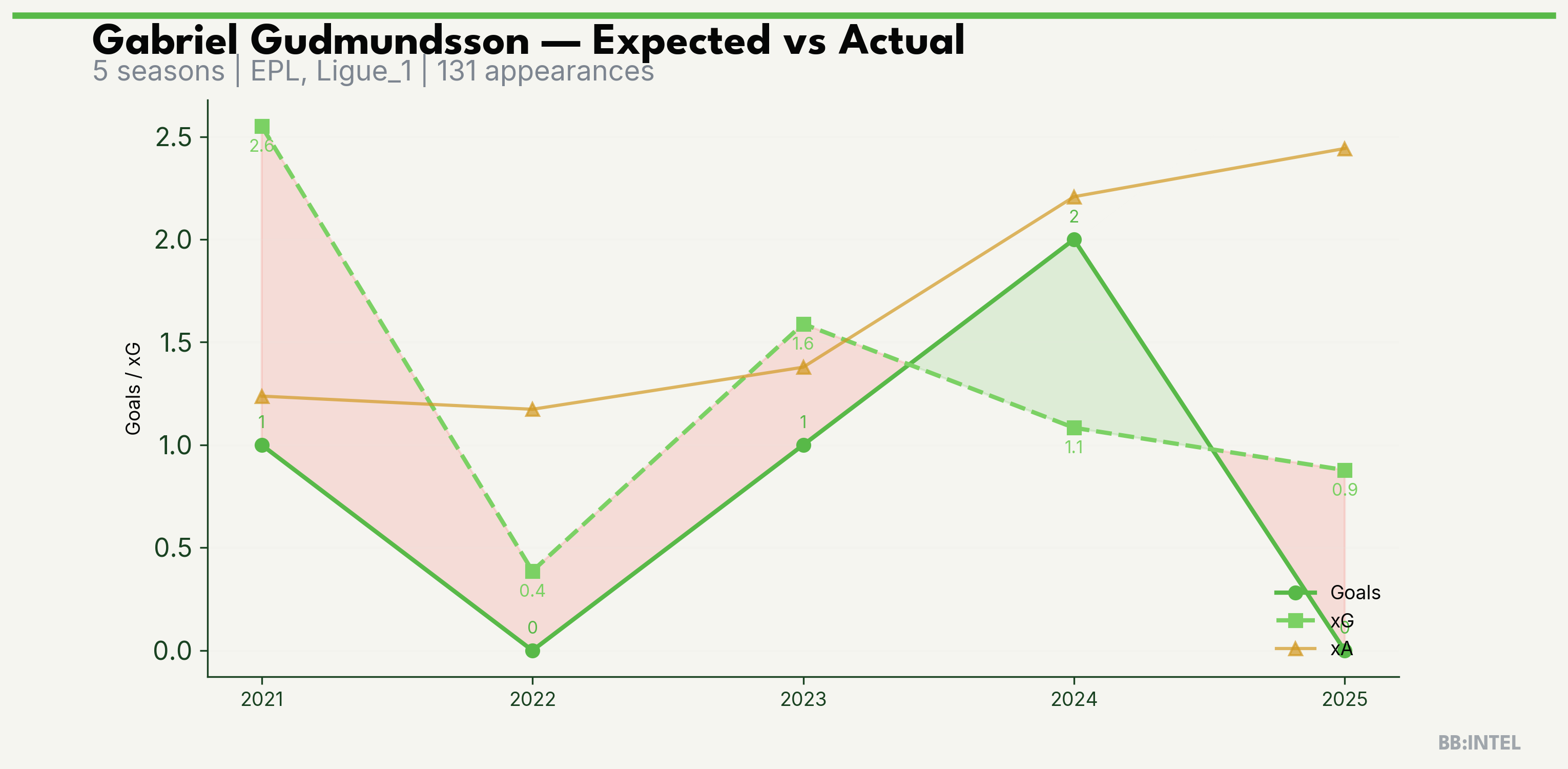 | 2025/2026 | EPL | 28 | 0 | 0.9 | 2.4 | 18 | -0.9 |