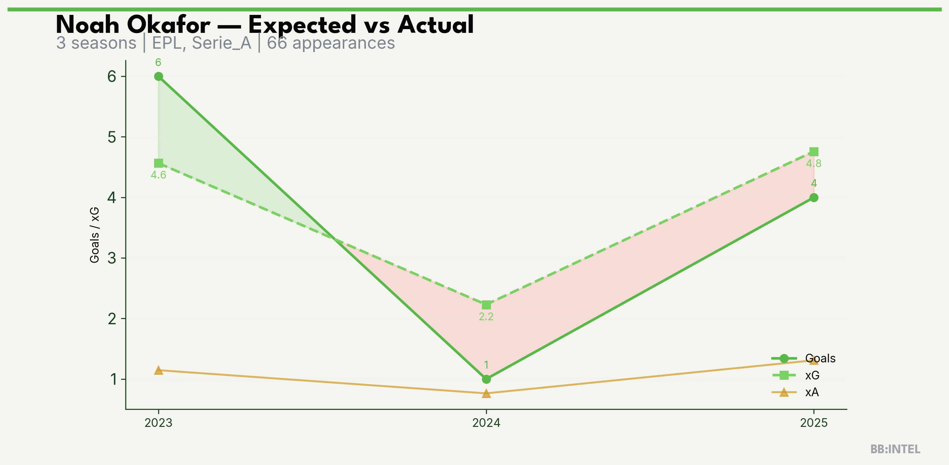 | 2025/2026 | EPL | 23 | 4 | 4.8 | 1.3 | 26 | -0.8 |