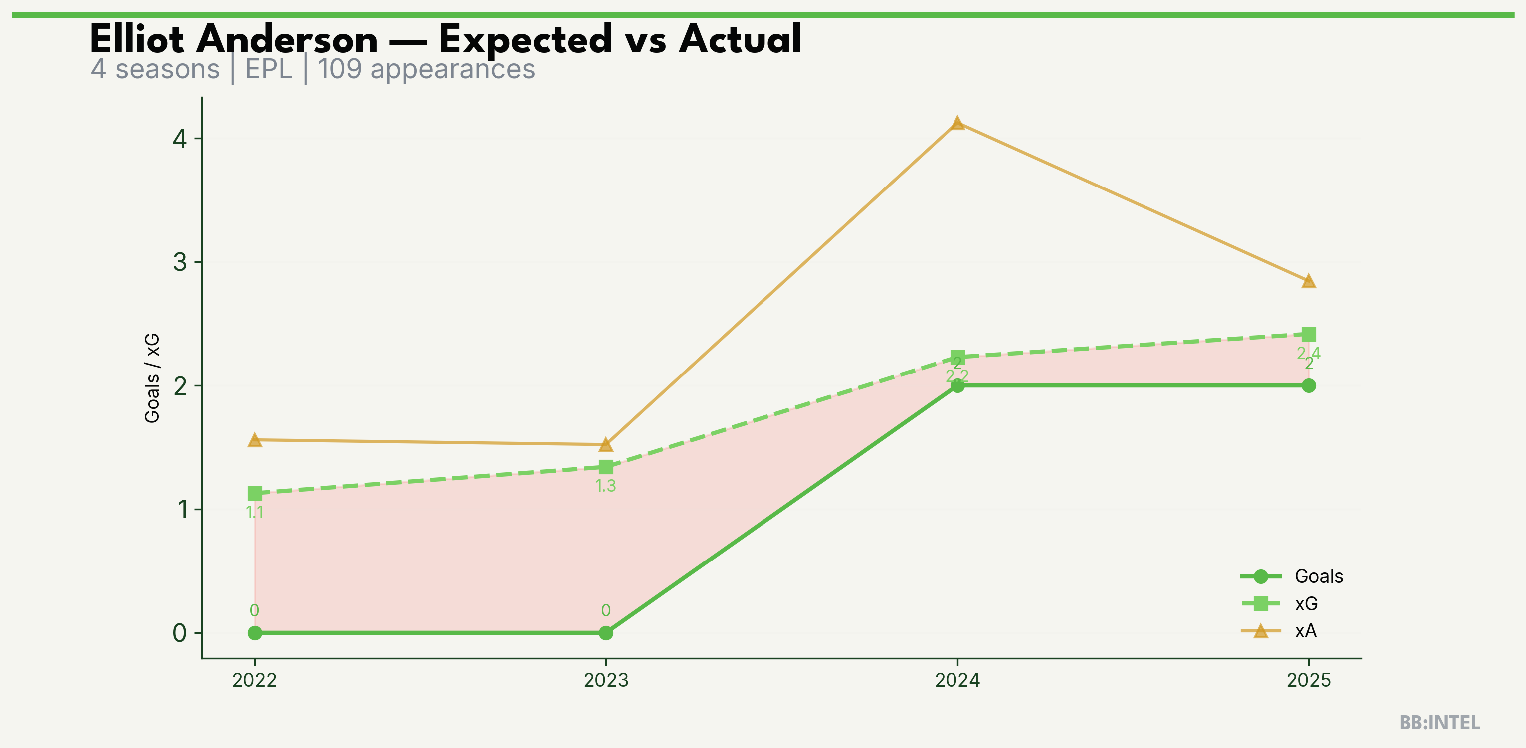 | 2025/2026 | EPL | 29 | 2 | 2.4 | 2.8 | 35 | -0.4 |
