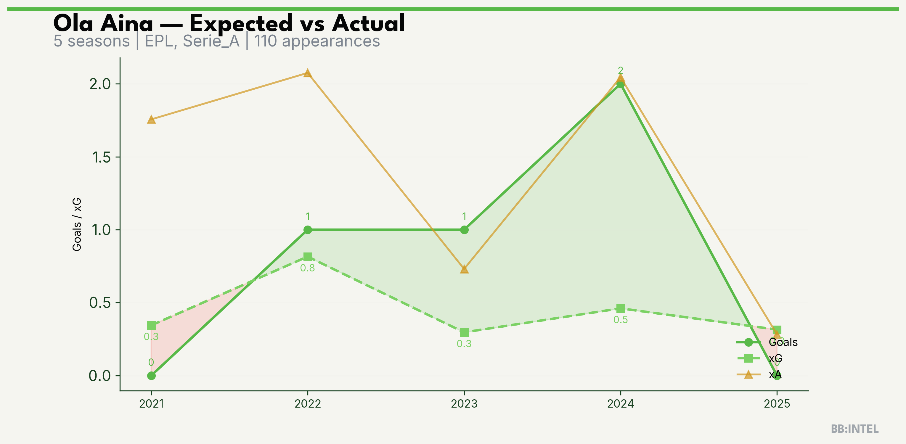 | 2025/2026 | EPL | 13 | 0 | 0.3 | 0.3 | 10 | -0.3 |