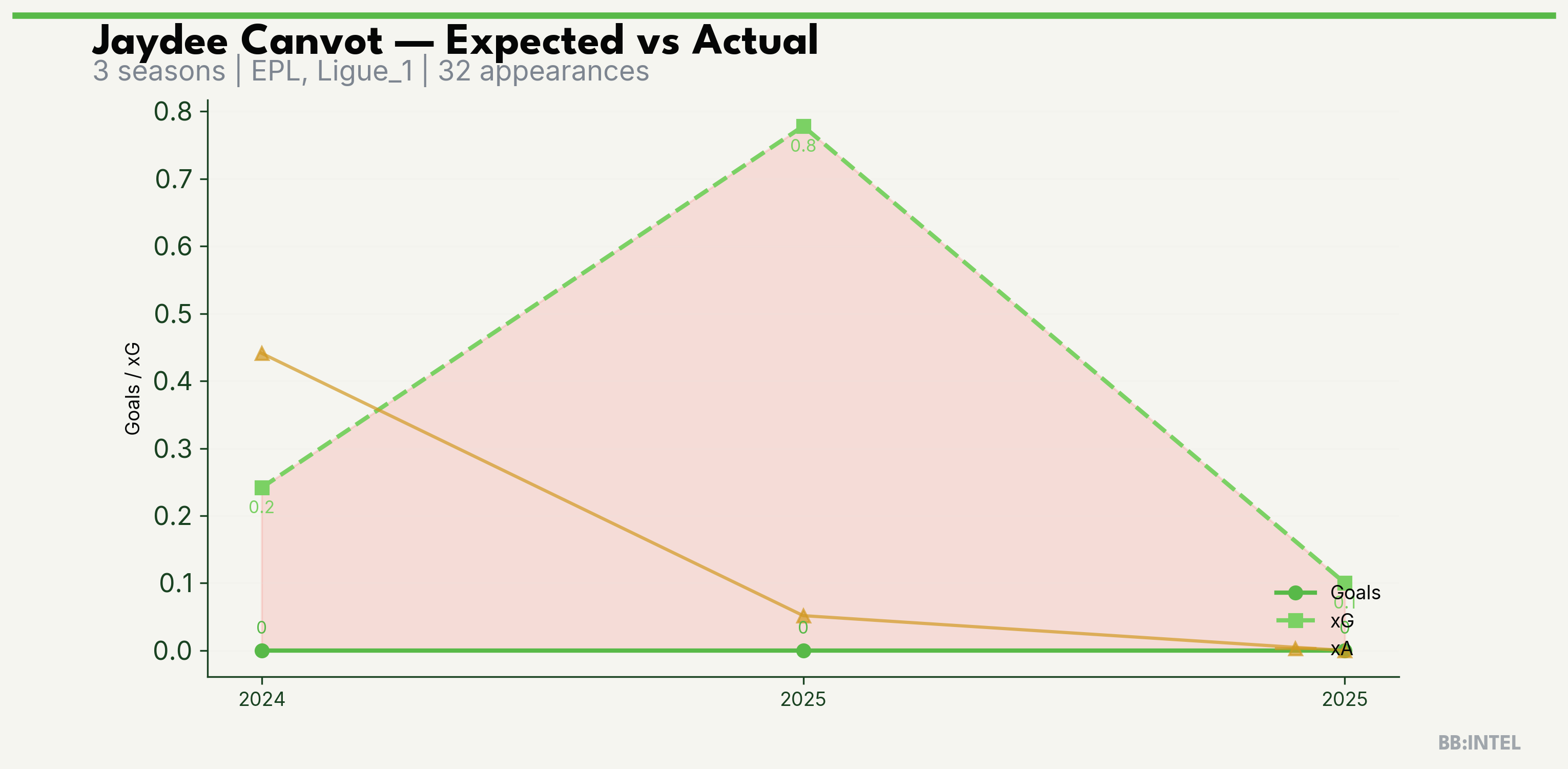 | 2025/2026 | EPL | 12 | 0 | 0.8 | 0.1 | 3 | -0.8 |