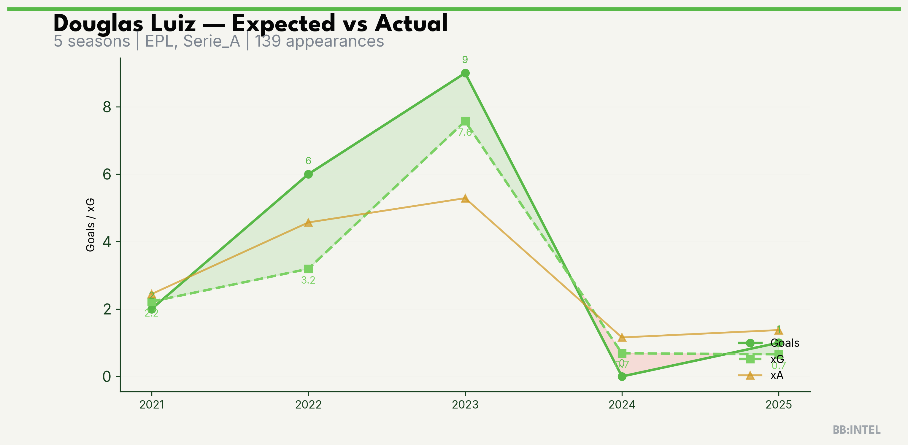| 2023/2024 | EPL | 35 | 9 | 7.6 | 5.3 | 48 | +1.4 |