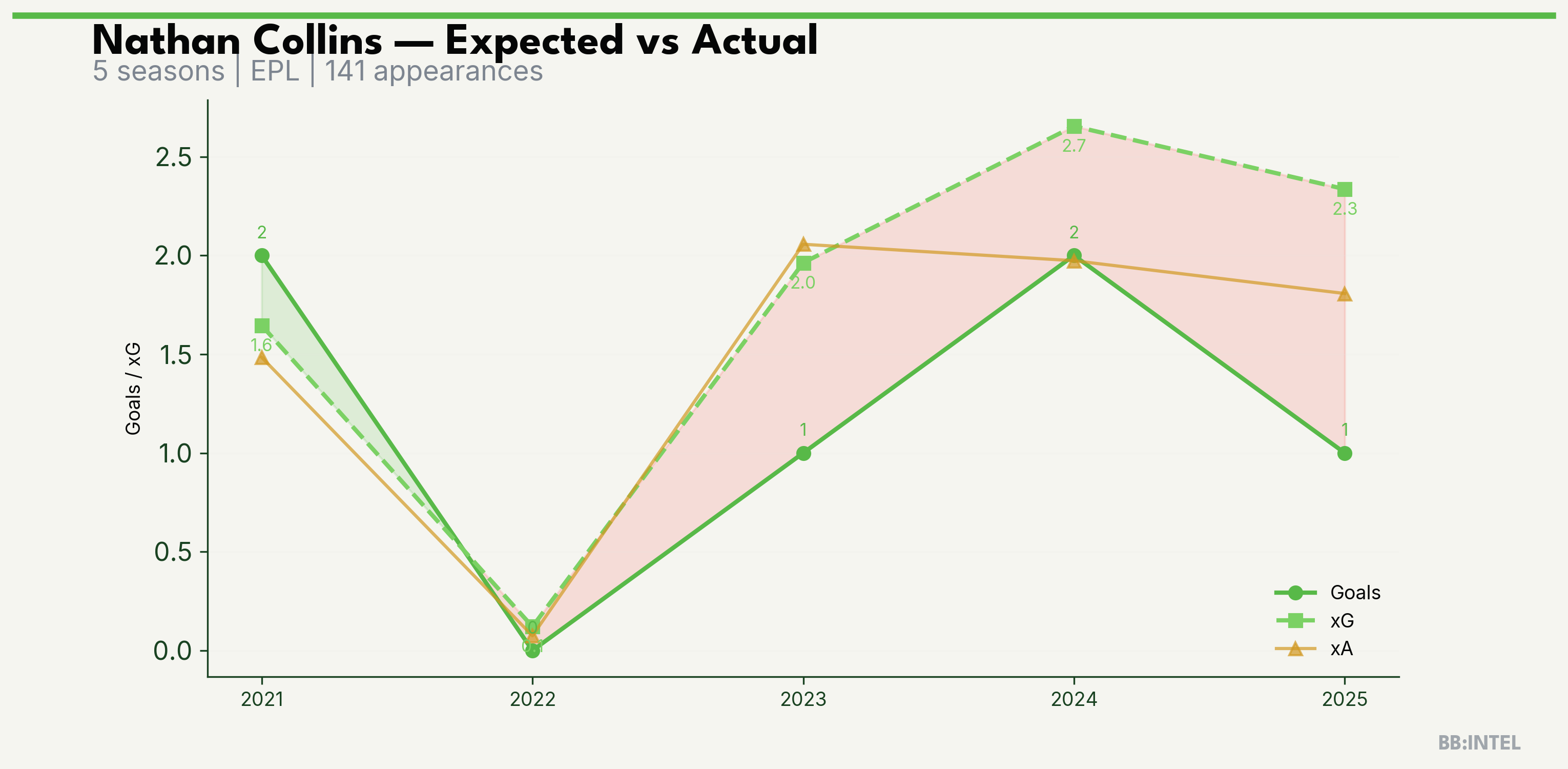 | 2023/2024 | EPL | 32 | 1 | 2.0 | 2.1 | 10 | -1.0 |