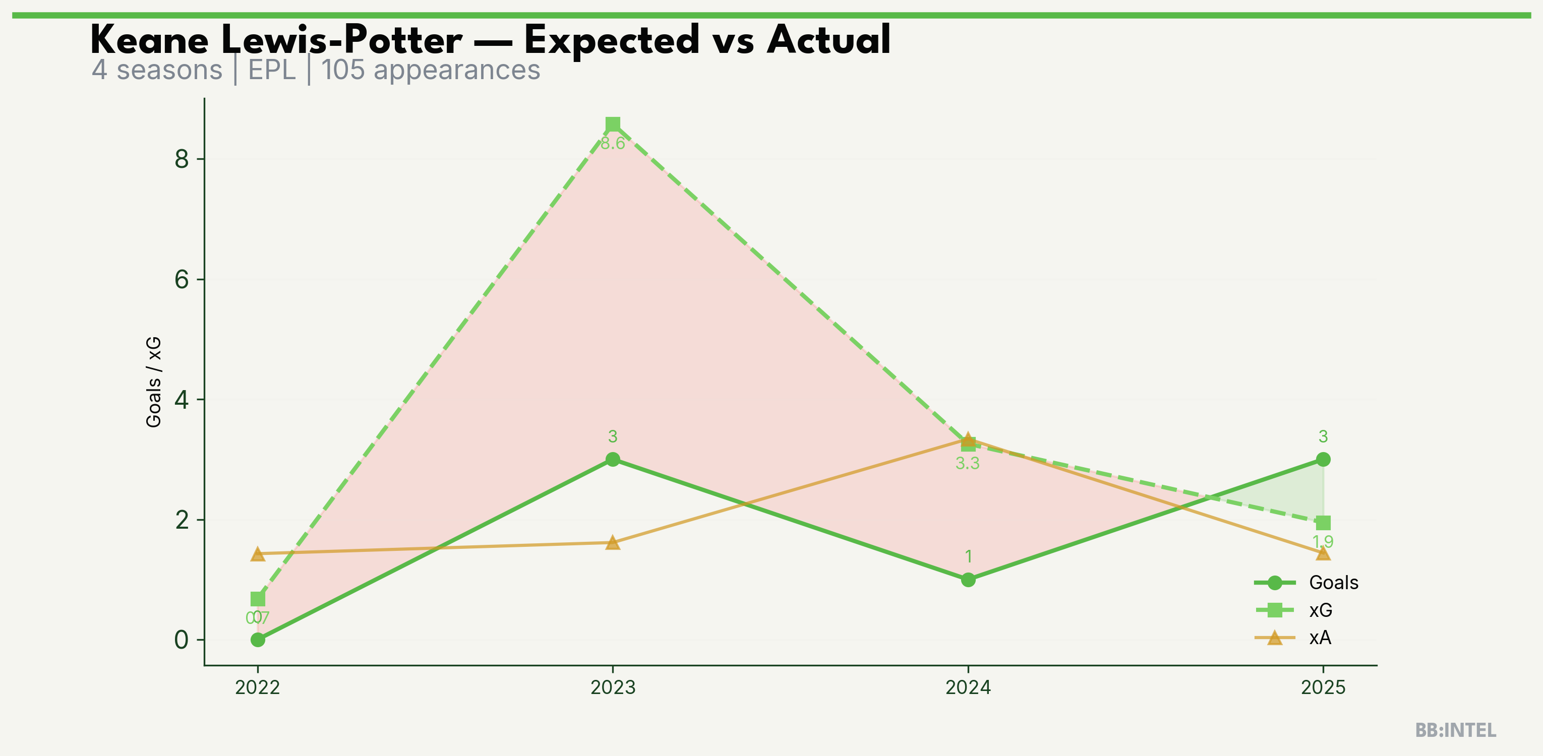 | 2023/2024 | EPL | 30 | 3 | 8.6 | 1.6 | 43 | -5.6 |