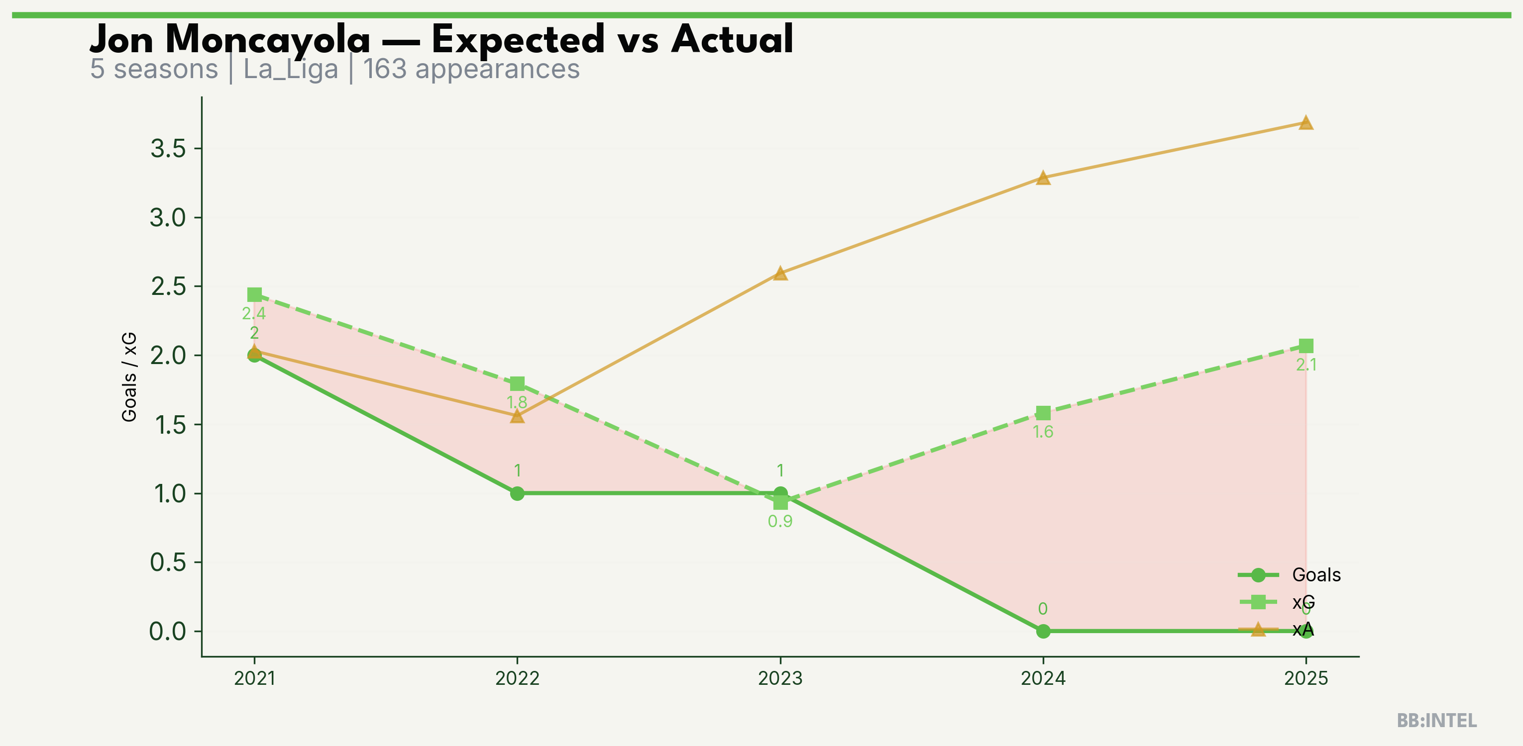 | 2025/2026 | La_Liga | 25 | 0 | 2.1 | 3.7 | 17 | -2.1 |