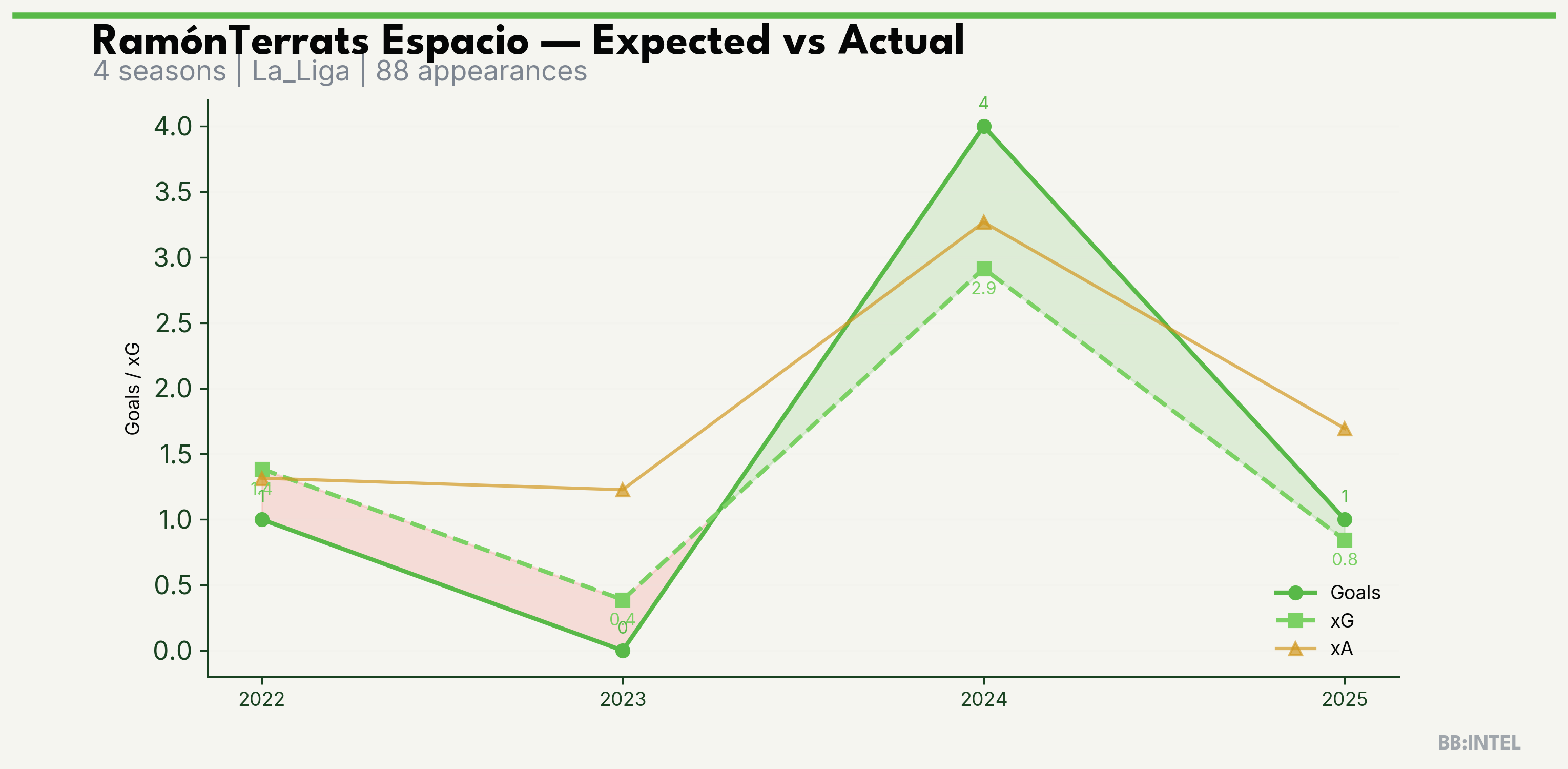 | 2024/2025 | La_Liga | 26 | 4 | 2.9 | 3.3 | 21 | +1.1 |