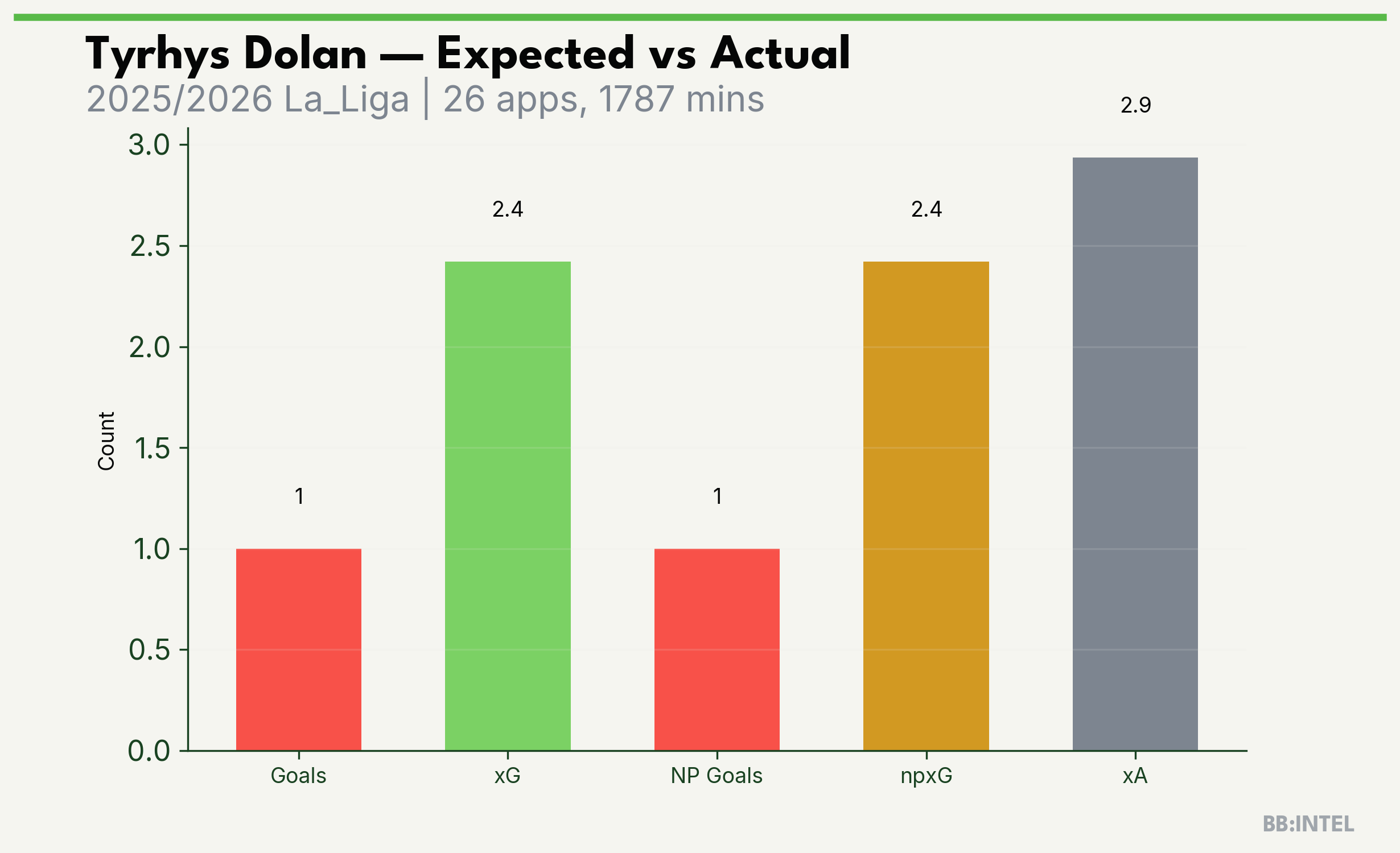 | 2025/2026 | La_Liga | 26 | 1 | 2.4 | 2.9 | 28 | -1.4 |