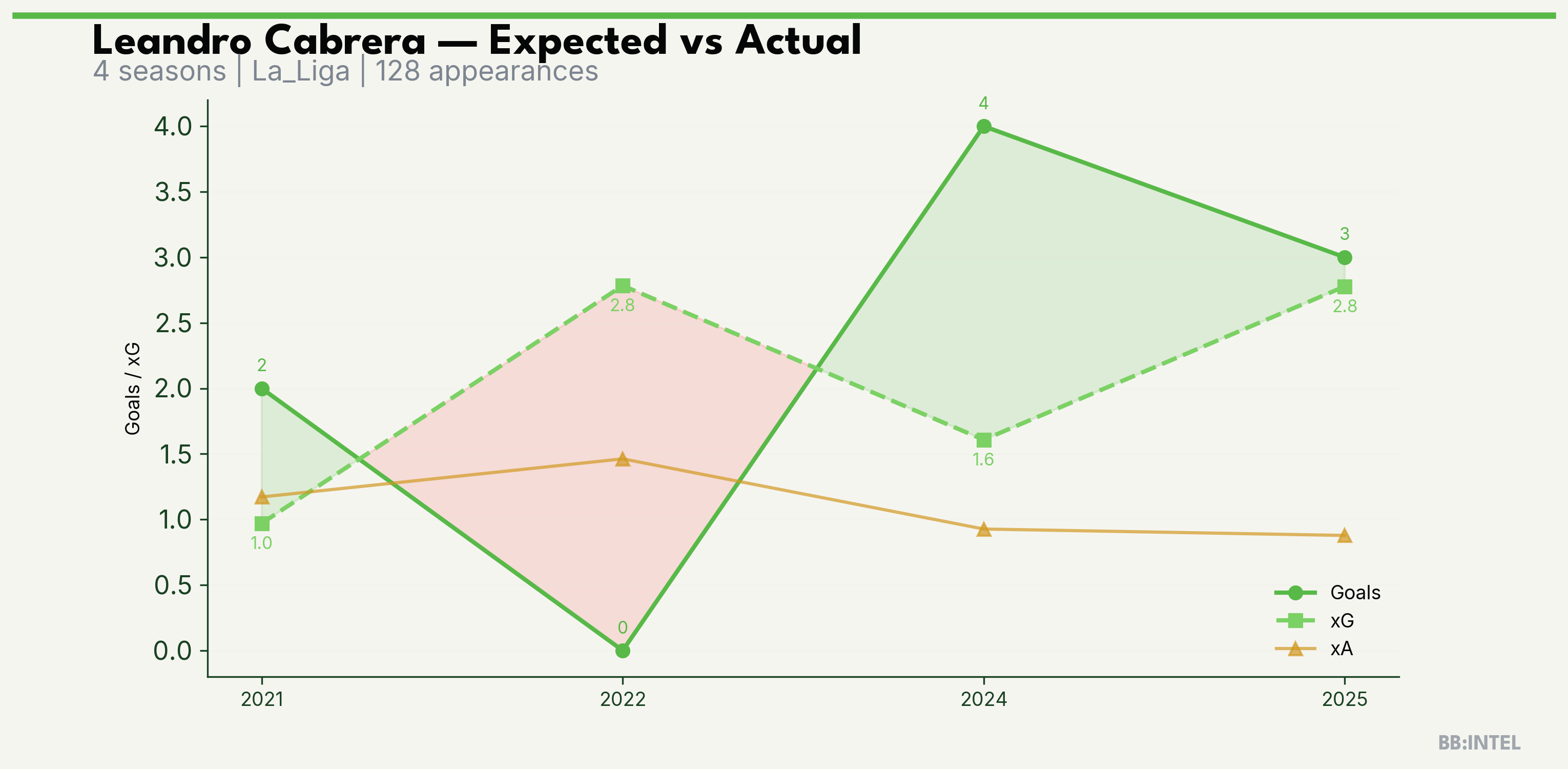 | 2025/2026 | La_Liga | 26 | 3 | 2.8 | 0.9 | 29 | +0.2 |