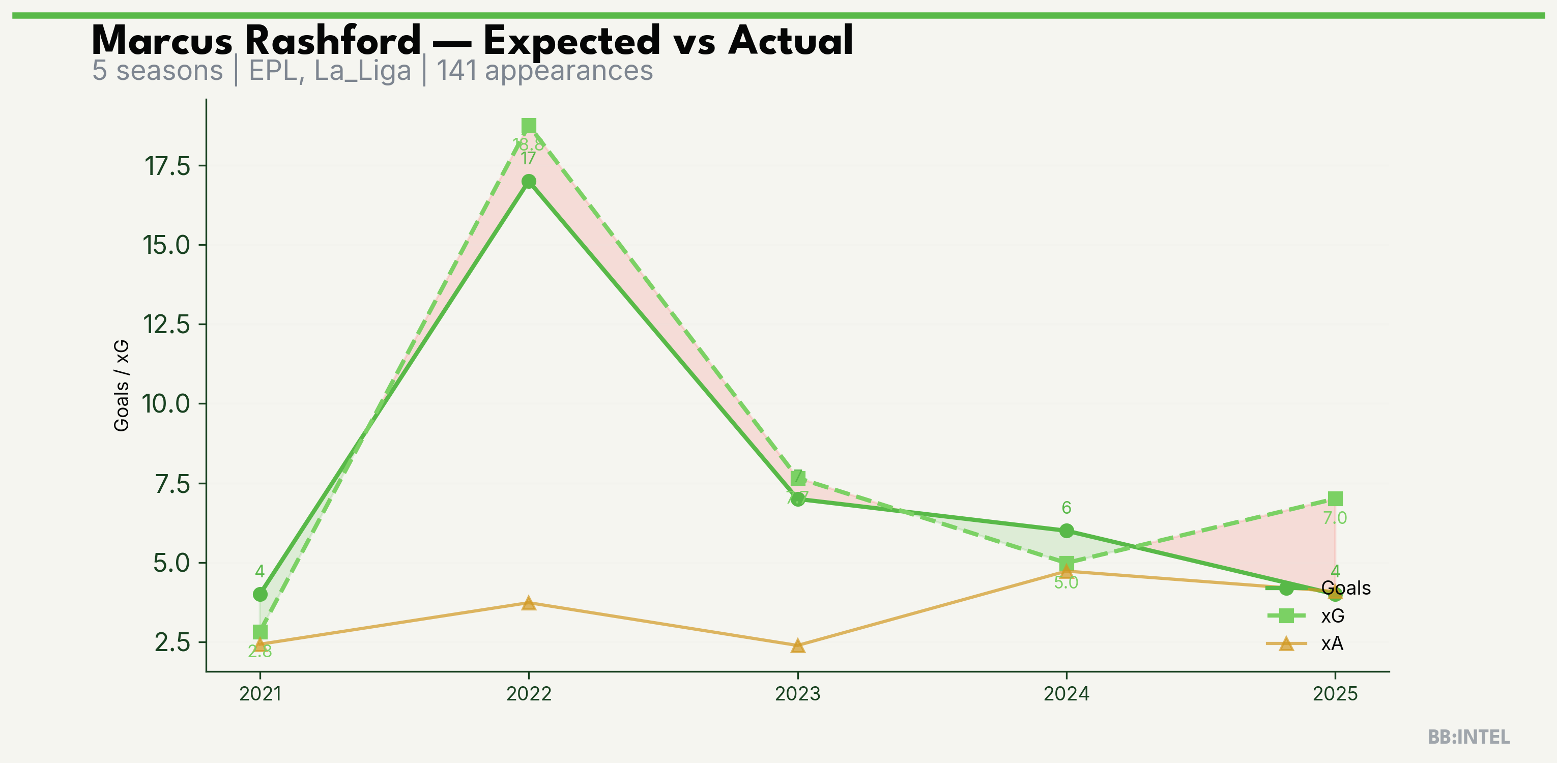 | 2024/2025 | EPL | 25 | 6 | 5.0 | 4.7 | 35 | +1.0 |
