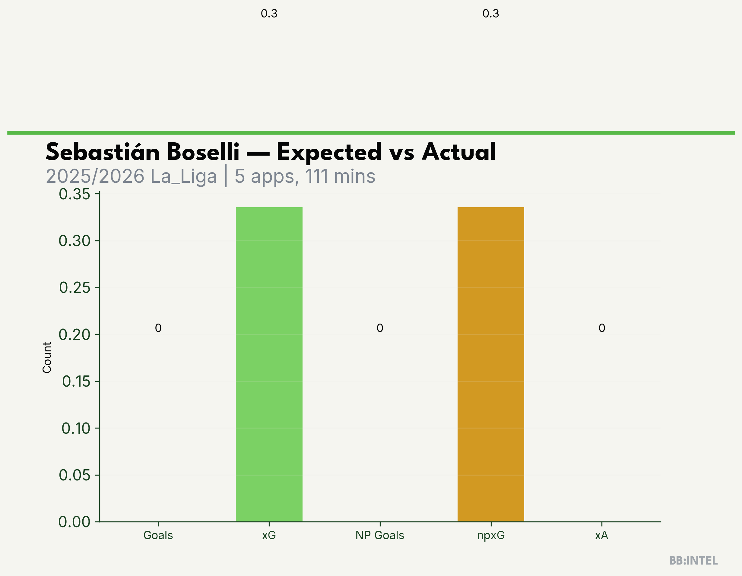 | 2025/2026 | La_Liga | 5 | 0 | 0.3 | 0.0 | 2 | -0.3 |